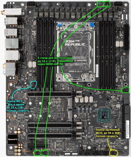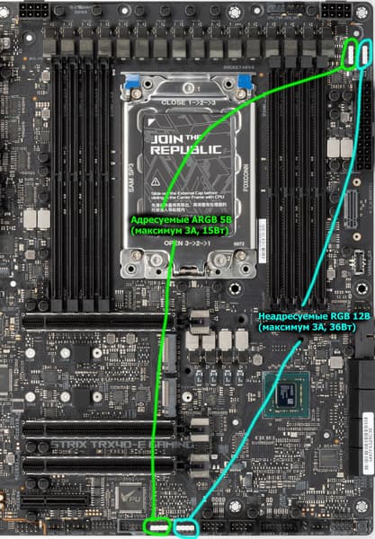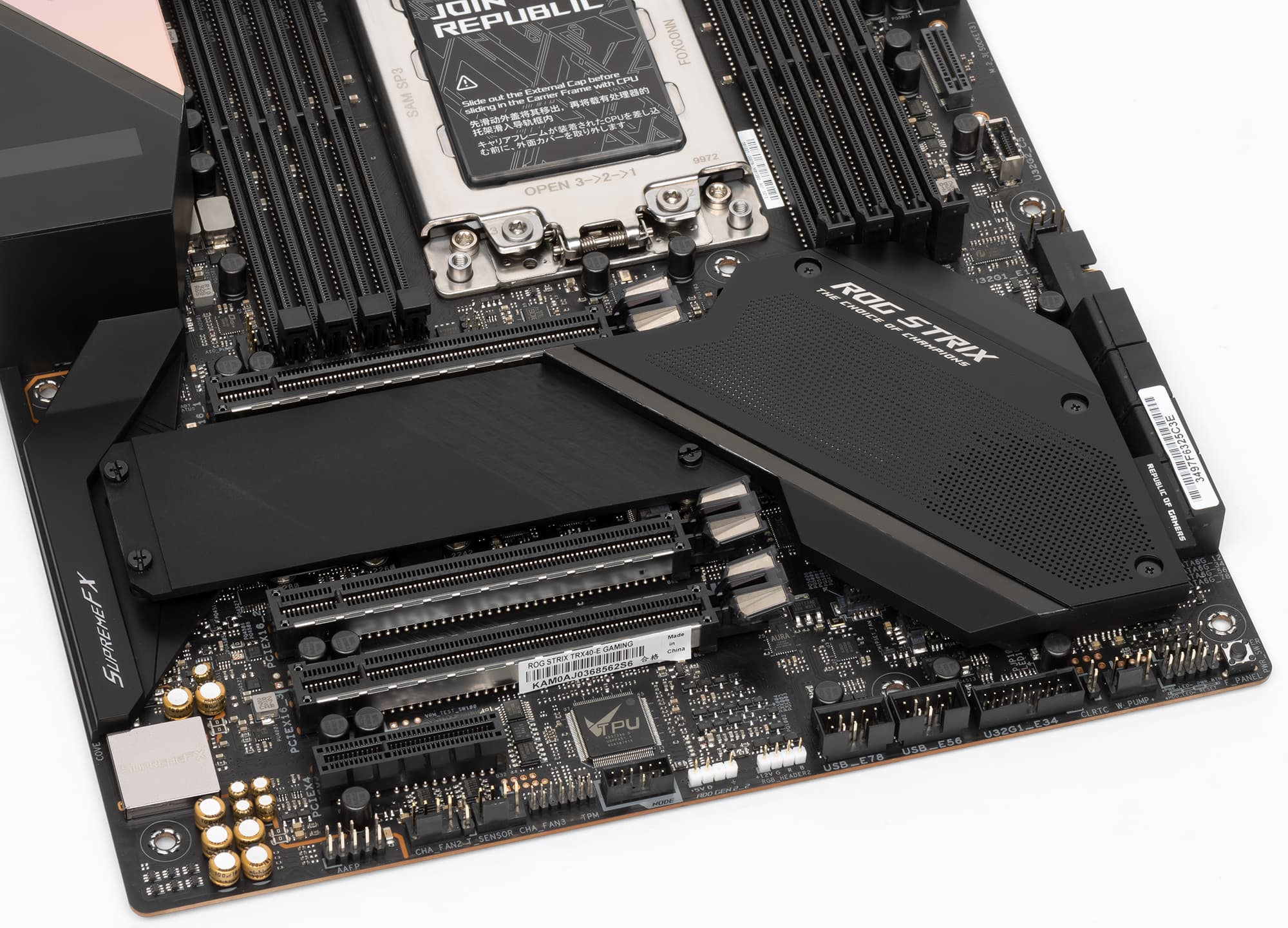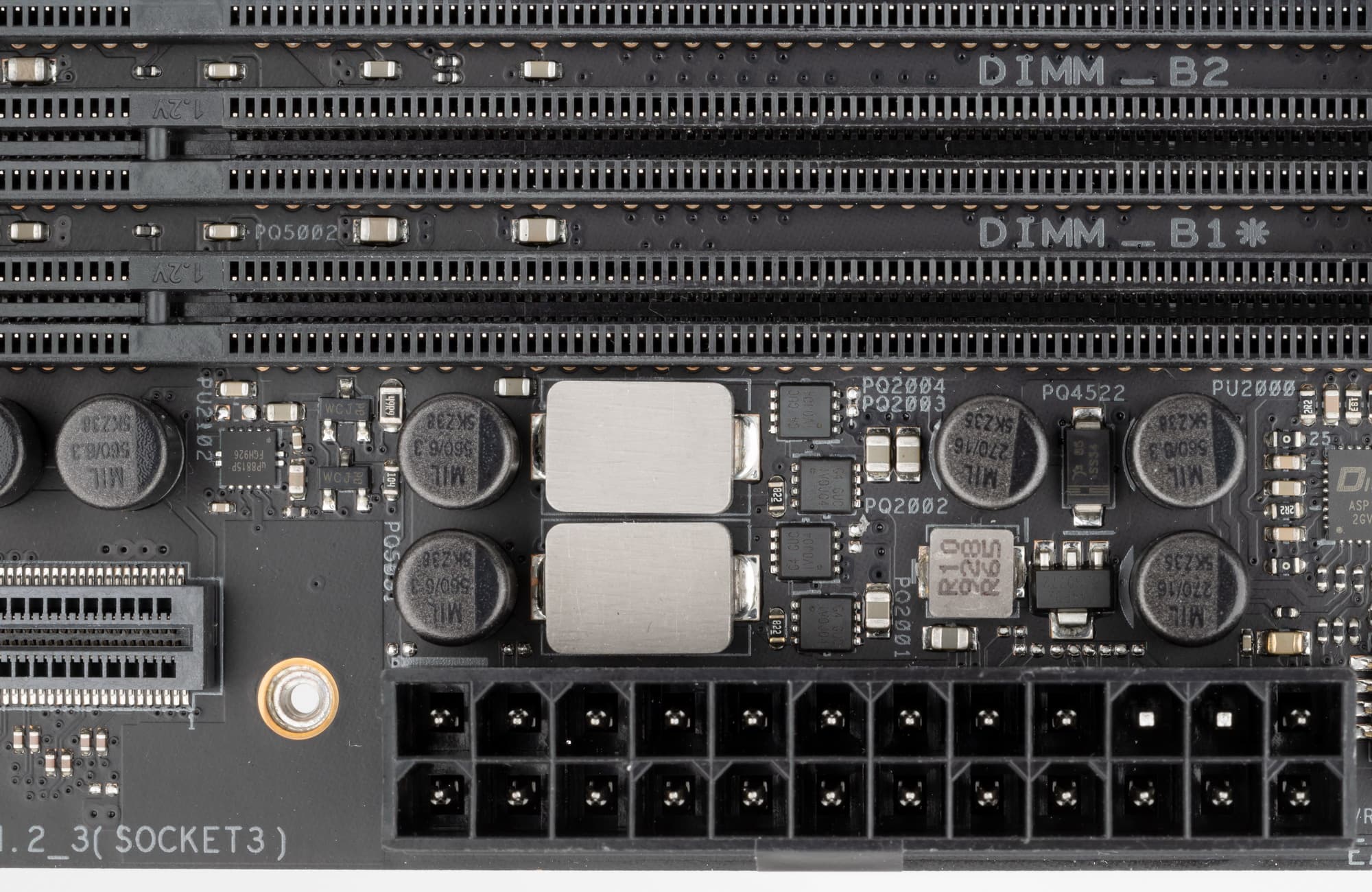 Система питания соответствует требованиям процессоров, которые очень много потребляют. Как мы знаем, у процессоров Ryzen Threadripper две схемы питания: для самого ядра и для SoC. Два 8-контактных гнезда EPS12V разнесены по разным концам PCB.