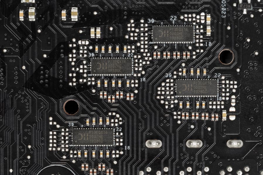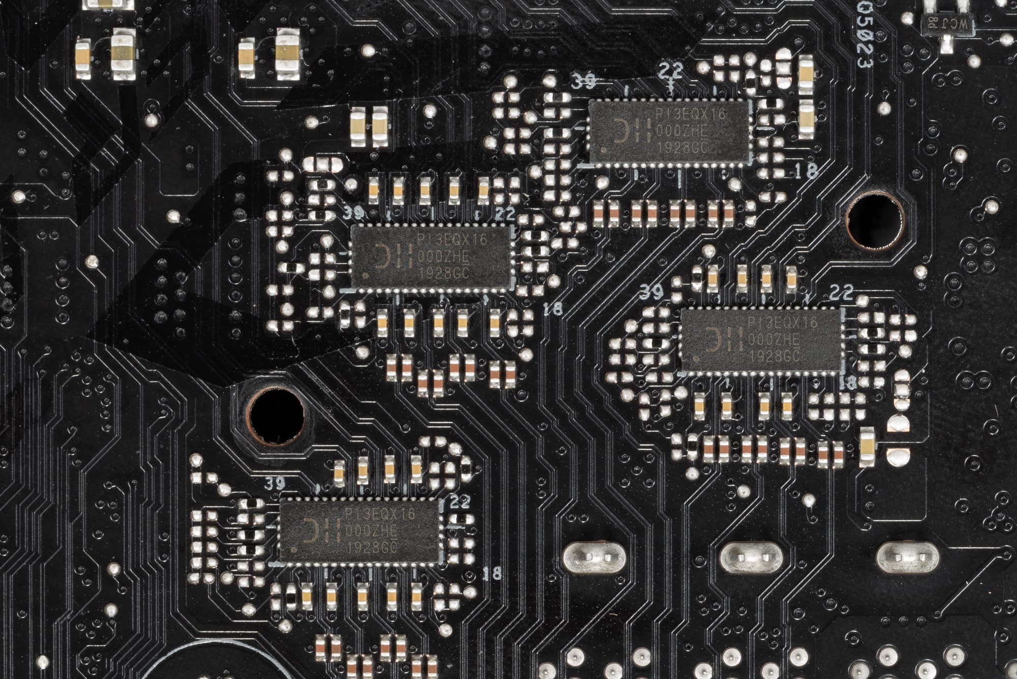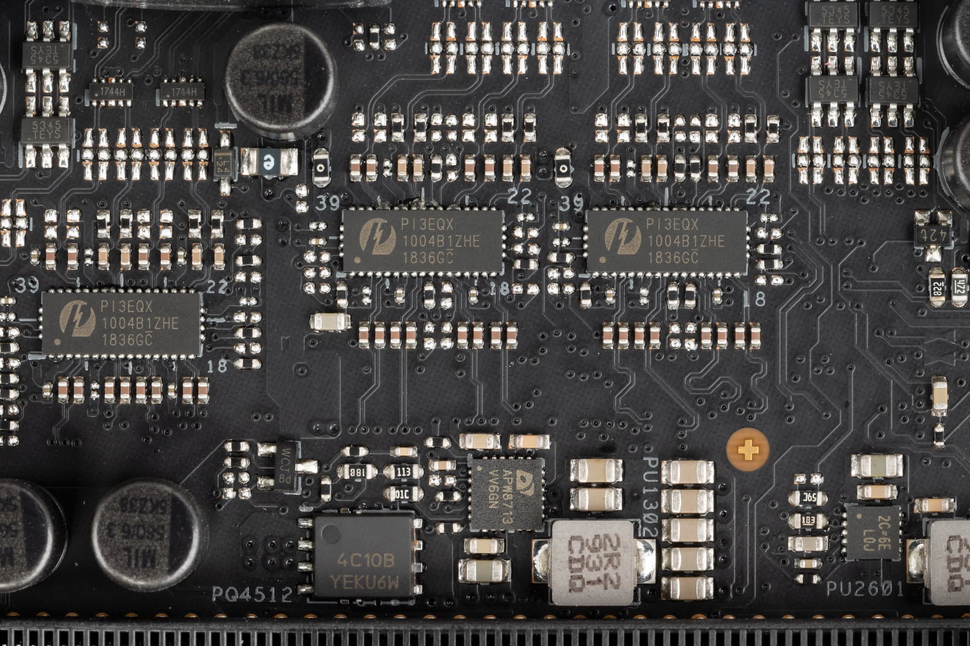 На оборотной стороне элементы имеются, в частности, ряд усилителей сигнала для шины PCI-e, один из ШИМ-контроллеров и другая мелкая логика. Обработан текстолит неплохо: во всех точках пайки острые концы срезаны.