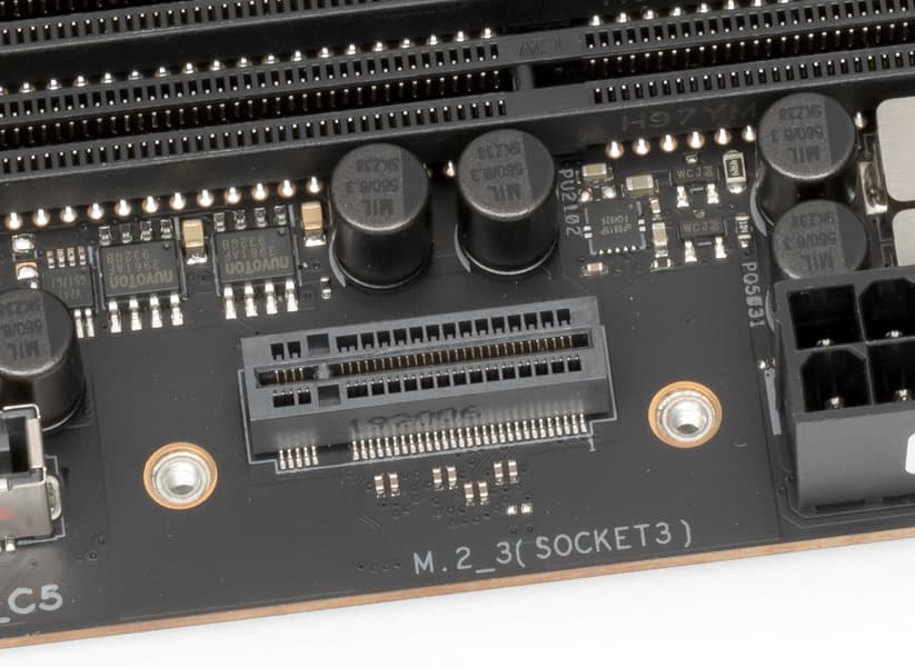 Теперь про M.2. Материнская плата имеет три гнезда такого форм-фактора: два — привычного горизонтального расположения, а один — вертикального.