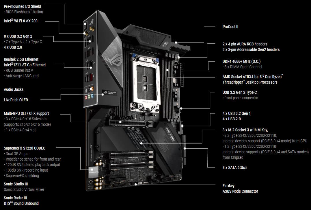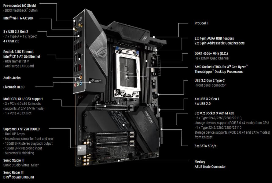 Еще раз надо напомнить, что ROG Strix TRX40-E Gaming поддерживает процессоры AMD Ryzen Threadripper 3-го поколений, выполненные под разъем (сокет) sTR4X.