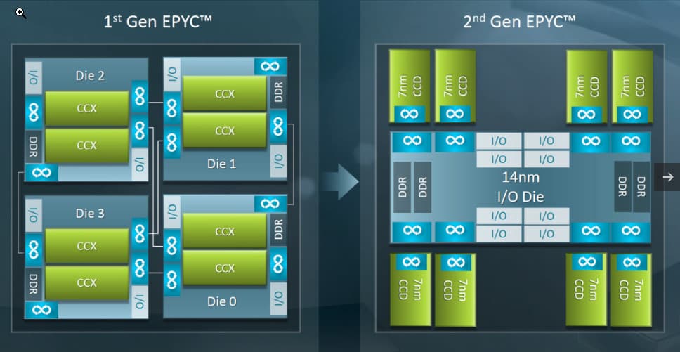 Если компания Intel до последнего момента предпочитала выпускать многоядерные решения в едином кристалле, мысленно проведя черту разделения массового сегмента ПК от премиального по признаку наличия 8 ядер и 16 потоков максимум для первого и до 18/36 для второго, то компания AMD пошла по другому пути.