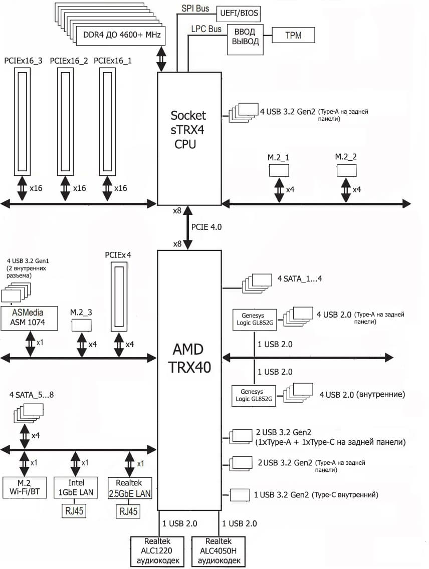 В свою очередь чипсет TRX40 обладает 24 линиями PCI-e 4.0, их которых опять же 8 зарезервированы для связи чипсета с процессором (остается свободных — 16). Далее 8 линий — свободно конфигурируются (на волю производителей матплат) (остается свободных — 8). Оставшиеся линии могут пойти либо на 8 портов SATA, либо из них можно сконфигурировать любые комбинации слотов PCI-ex1, PCI-ex2, PCI-ex4. Разумеется, и тут есть выбор у производителей материнок.