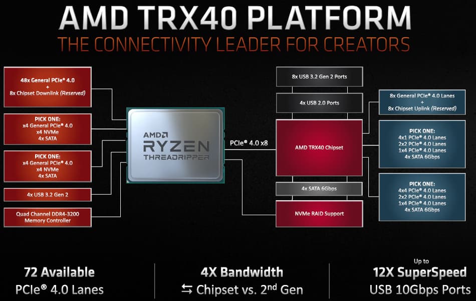 Сам Ryzen Threadripper 3ххх обладает 64 линиями PCI-e 4.0, которых 8 всегда используются для связи процессора с чипсетом (остается свободных — 56).