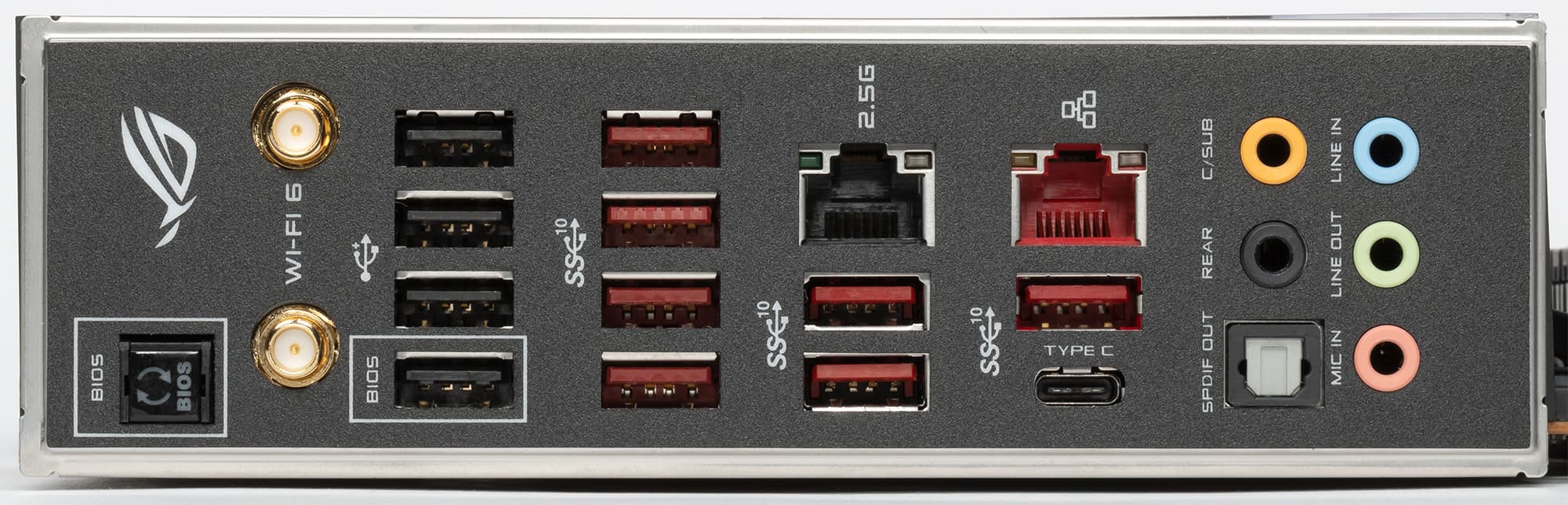 | Разъемы на задней панели | 1 × USB 3.2 Gen2 (Type-C) 7 × USB 3.2 Gen2 (Type-A) 4 × USB 2.0 (Type-A) 2 × RJ-45 5 аудиоразъемов типа миниджек 2 антенных разъема 1 × S/PDIF (оптический, выход) кнопка перепрошивки BIOS — Flashback |