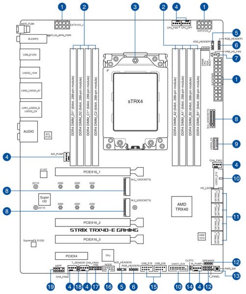 | Разъемы для накопителей | 8 × SATA 6 Гбит/с (TRX40) 1 × M.2 (TRX40, PCI-e 4.0 x4/SATA 6 Гбит/с для устройств формата 2242/2260/2280/22110) 2 × M.2 (CPU, PCI-e 4.0 x4 для устройств формата 2242/2260/2280/22110) |