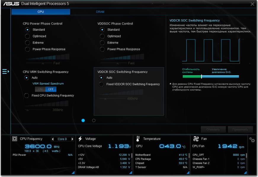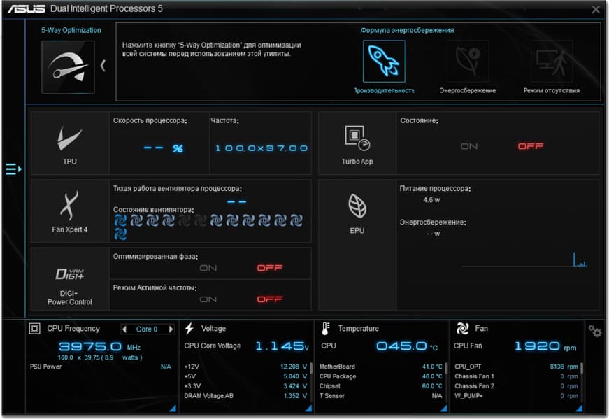 Основная программа — AI-Suite. В ней все управление параметрами работы материнской платы, и основным элементом является Dual Intelligent Processors 5 — программа настройки работы всей платы по частотам, вентиляторам и напряжениям.
