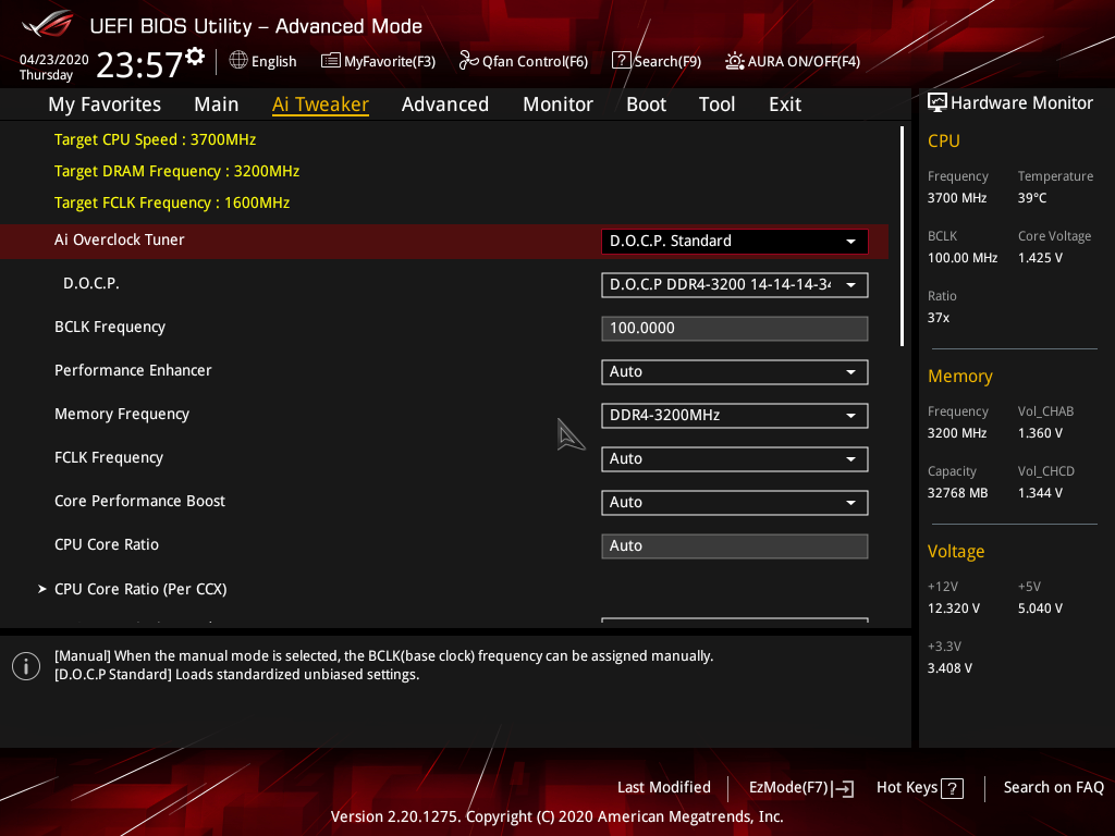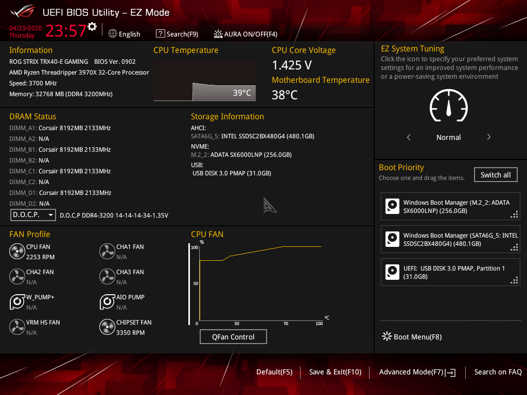 ROG Strix TRX40-E Gaming — сбалансированная материнская плата для HEDT со стоимостью 40-45 тысяч рублей (ценники на платы этого сегмента начинаются с 25-27 тысяч). Она предлагает прекрасную поддержку периферии: 21 порт USB всех видов (при этом аж 9 самых быстрых), 3 слота PCIe x16, которые всегда имеют 16 линий без разделения ресурсов с иной периферией, 2 сетевых проводных соединения (одно из которых — 2,5 Гбит/с), современный скоростной беспроводной контроллер Wi-Fi 6. Также материнская плата имеет 3 слота M.2, поддерживающие накопители всех возможных размеров. Система питания предлагает 16 фаз для ядра и 4 для SoC, она способна обеспечить работу любых совместимых процессоров под серьезным авторазгоном. Поскольку плата ориентирована на геймеров и любителей разгона, она оснащена соответствующим ПО и предлагает огромный набор оверклокерских опций в BIOS Setup. Впрочем, понятно, что позиционирование столь дорогих материнских плат для геймеров чисто условное, сегмент HEDT подразумевает использование таких решений не для игр.