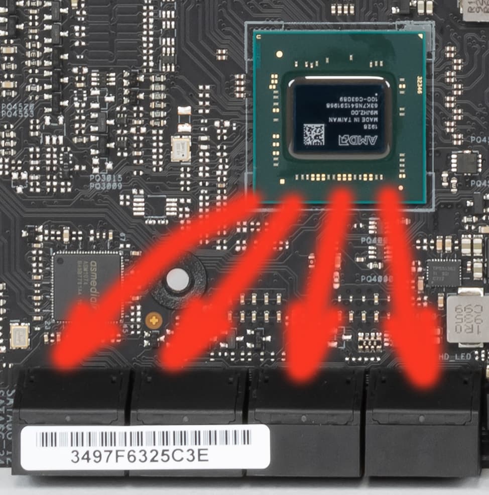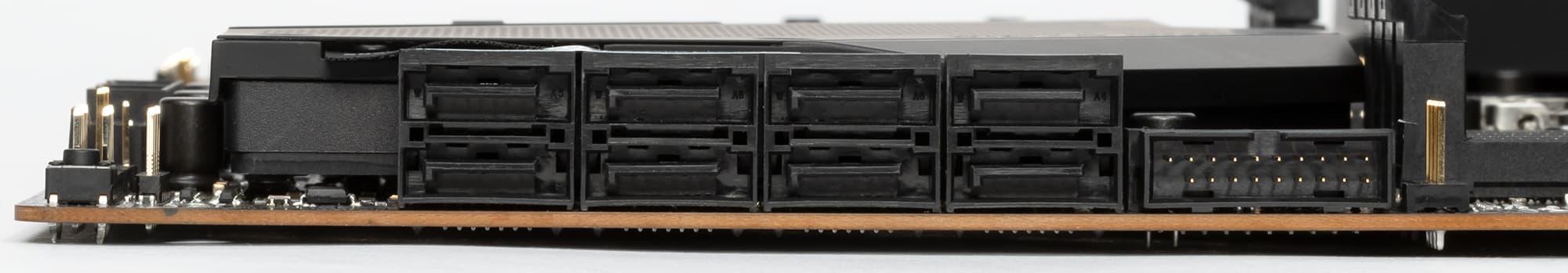 Всего у платы 8 разъемов Serial ATA 6 Гбит/с + 3 слотов для накопителей в форм-факторе M.2. (Еще один слот M.2 занят контроллером беспроводных сетей Wi-Fi/Bluetooth.) Все 8 портов SATA реализованы через чипсет TRX40 (4 порта штатно, а на еще 4 порта ушли свободные PCI-e линии).