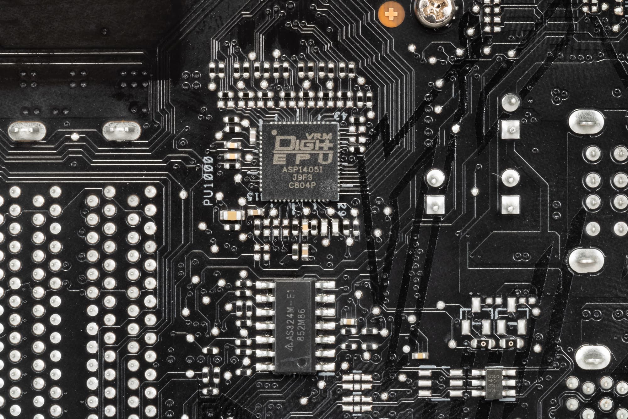 Да, все по-прежнему, все по-старому... Не менее традиционно фазами ядра управляет цифровой контроллер Digi+ ASP1405I (он же перемаркированный IR35201, умеющий работать максимум с 8 фазами, и он установлен на оборотной стороне платы).