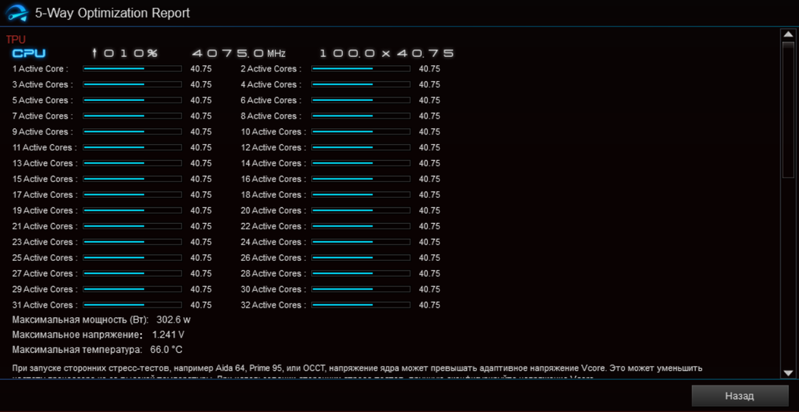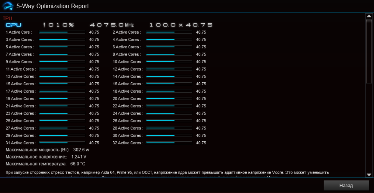 Максимум, который был найден программой, — составил 4,075 ГГц по всем ядрам. Ну я решил чуть-чуть улучшить и уже вручную выставил 4,1 ГГц также по всем ядрам. Прогнал тесты на стабильность — все прошло хорошо. Температура CPU лишь изредка поднималась до 95 °C, но в основном СО все же ее сбивала до 90. Параметры работы VRM/PCH особо не менялись.