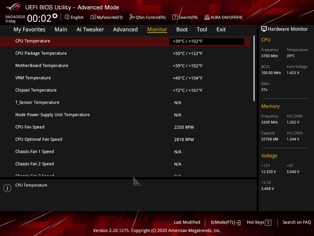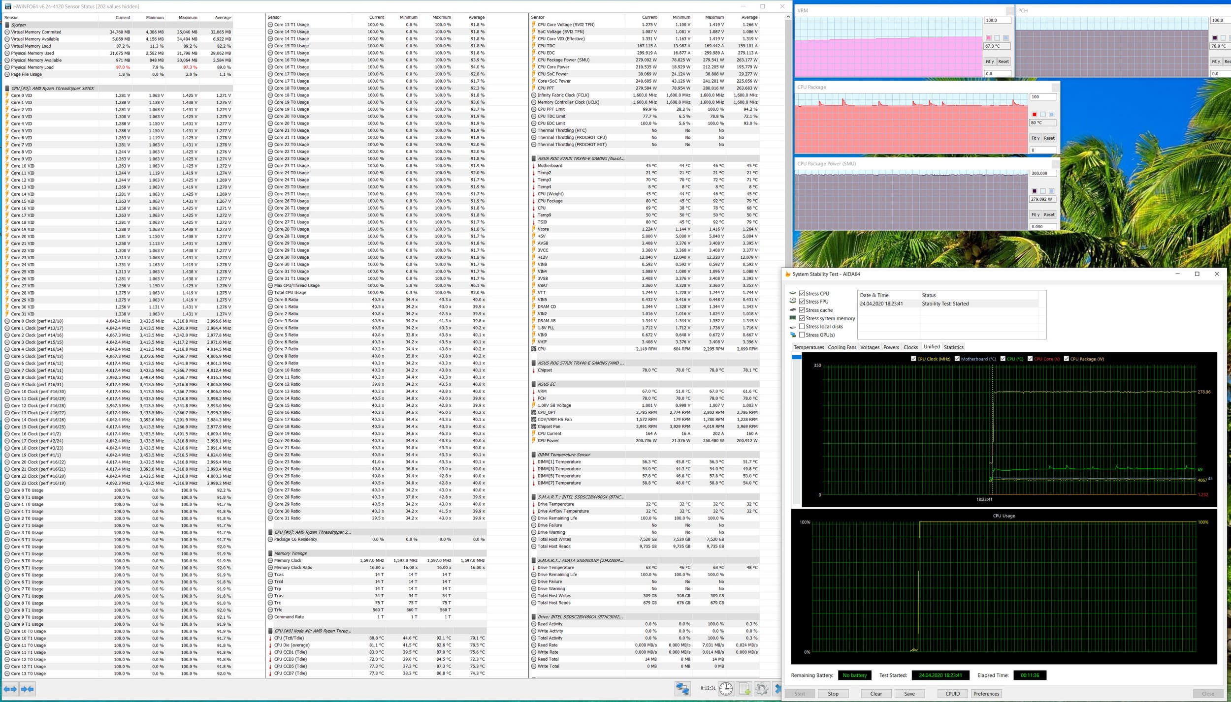 Нагрев остальных элементов материнской платы был в норме (VRM до 68 °C, чипсет TRX40 — до 79 °C). При этом чипсетный вентилятор работал на частотах до 4000 оборотов в минуту (шум почти не ощущался — установили очень хороший вентилятор), а вентиляторы на VRM практически редко включались.