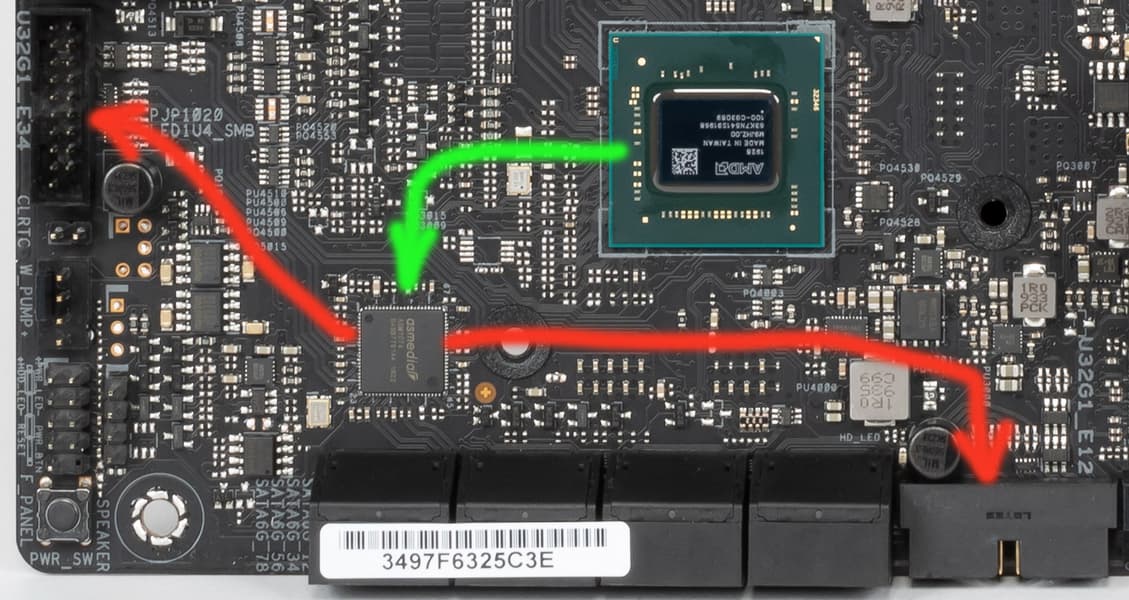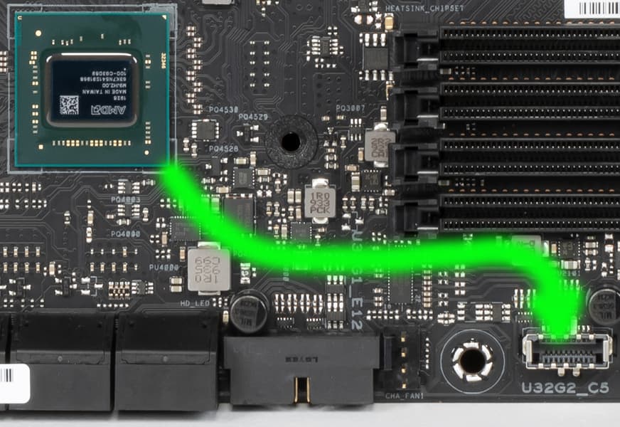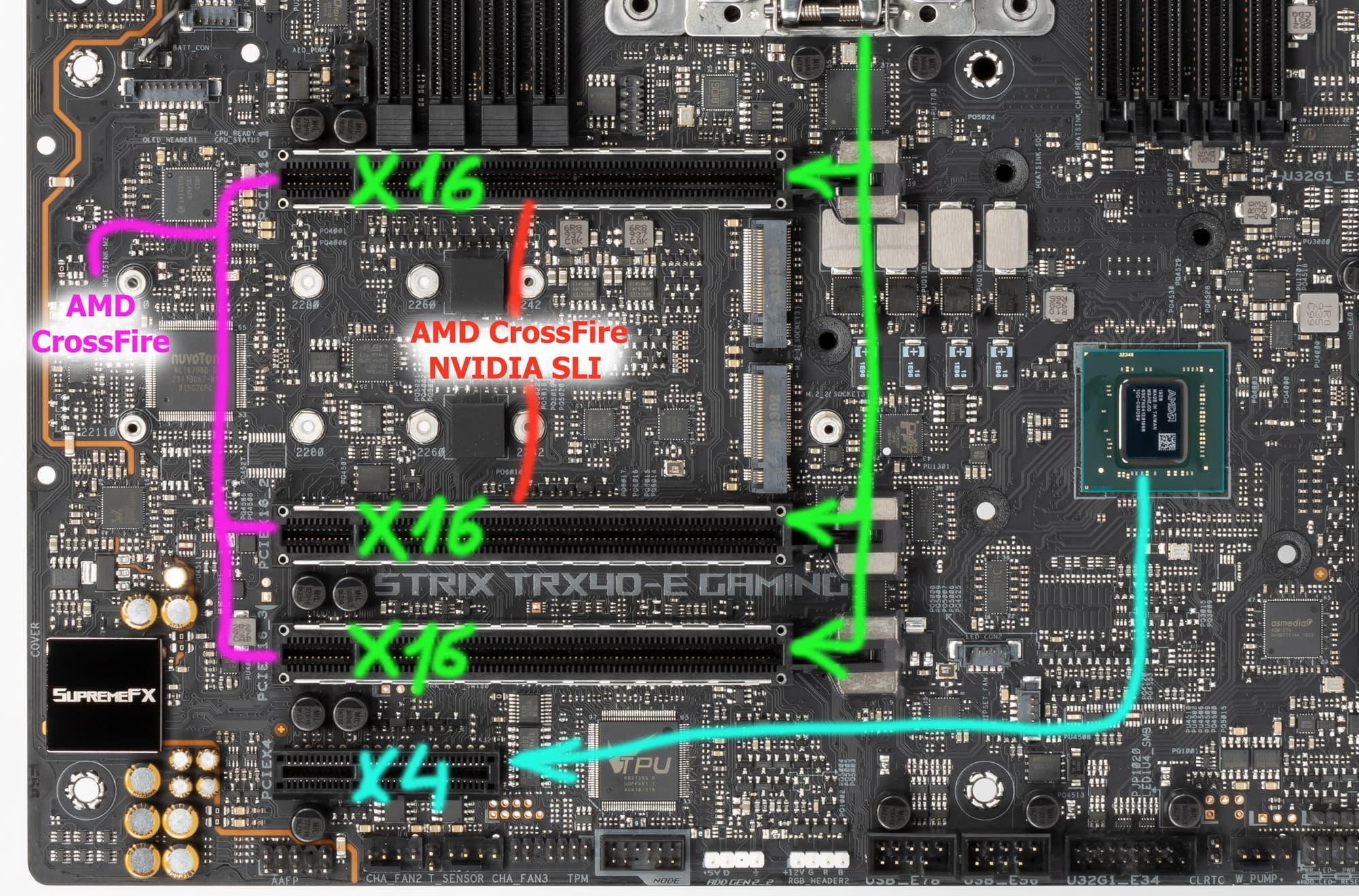 Итак, кроме USB-портов, к которым мы подойдем позже, чипсет TRX40 обладает свободными 16 PCI-e линиями. Считаем, сколько линий уходит на поддержку (связь) с тем или иным элементом именно у TRX40: