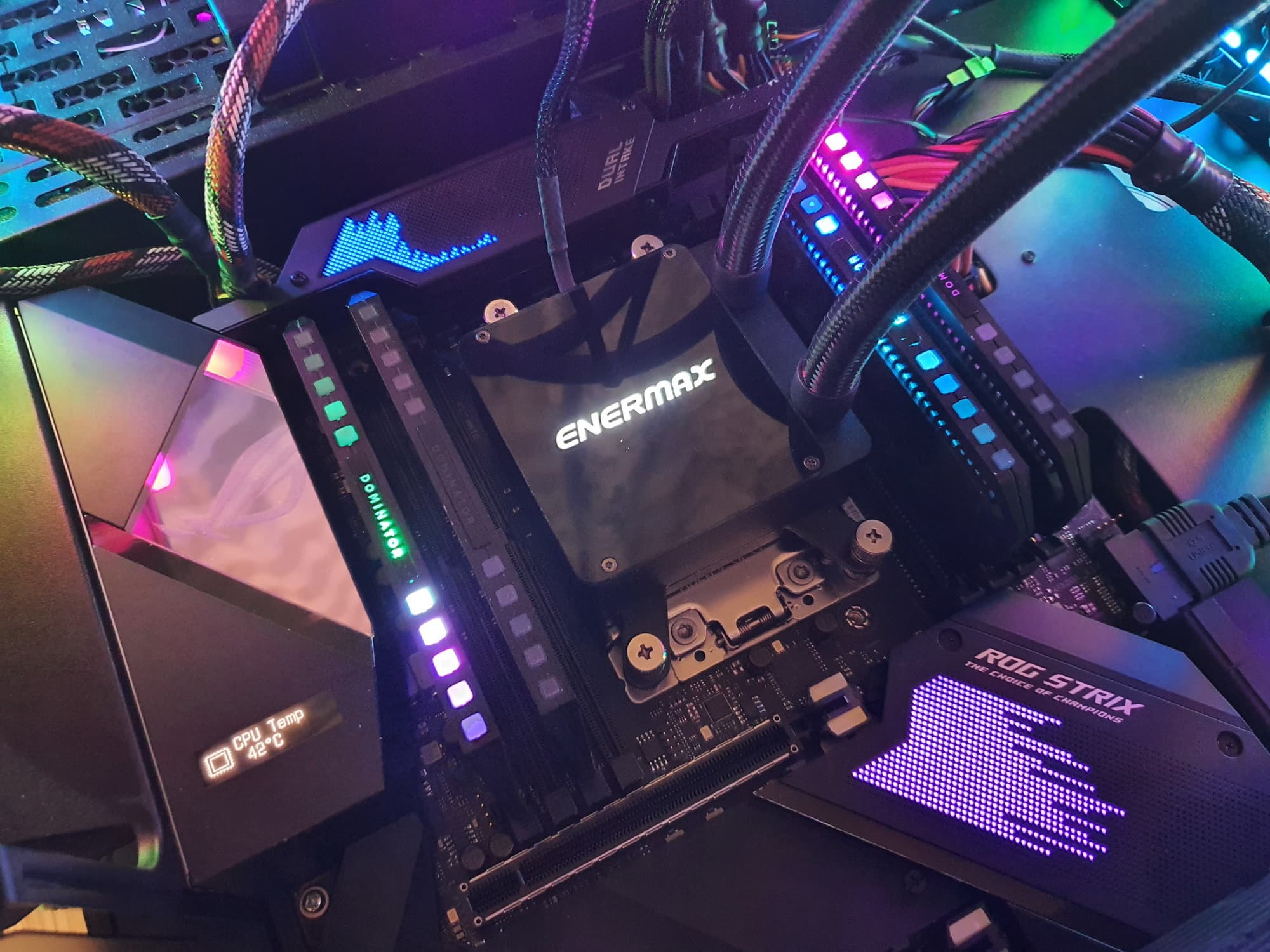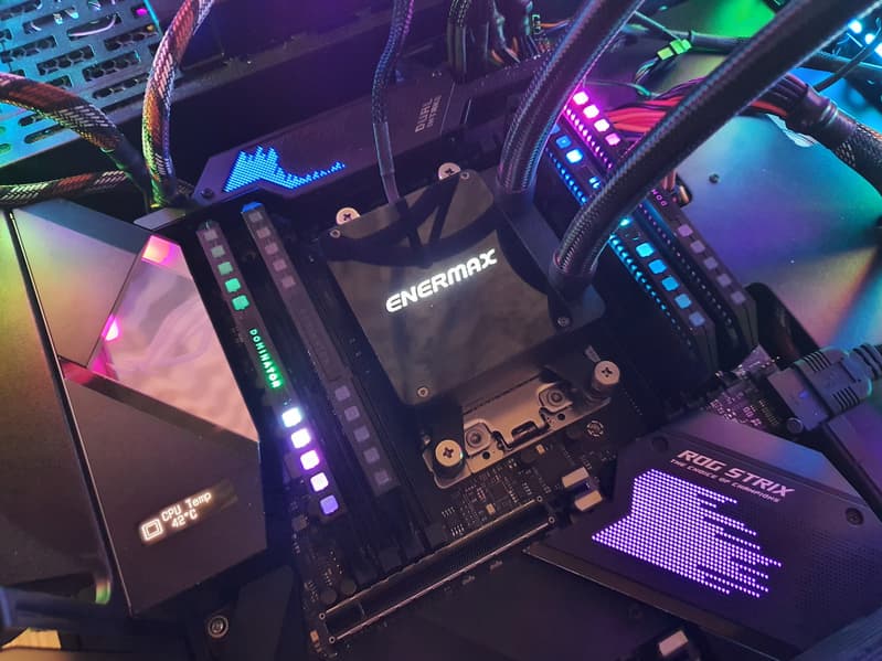 По умолчанию работаем с ЖСО от Enermax, которая покрывает крышку процессора наиболее полно, а также поддерживает TDP до 500 Вт. Запускаем все в режиме по умолчанию. Затем нагружаем тестом от AIDA.