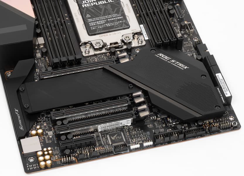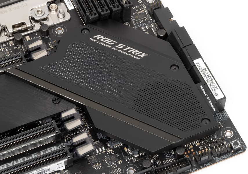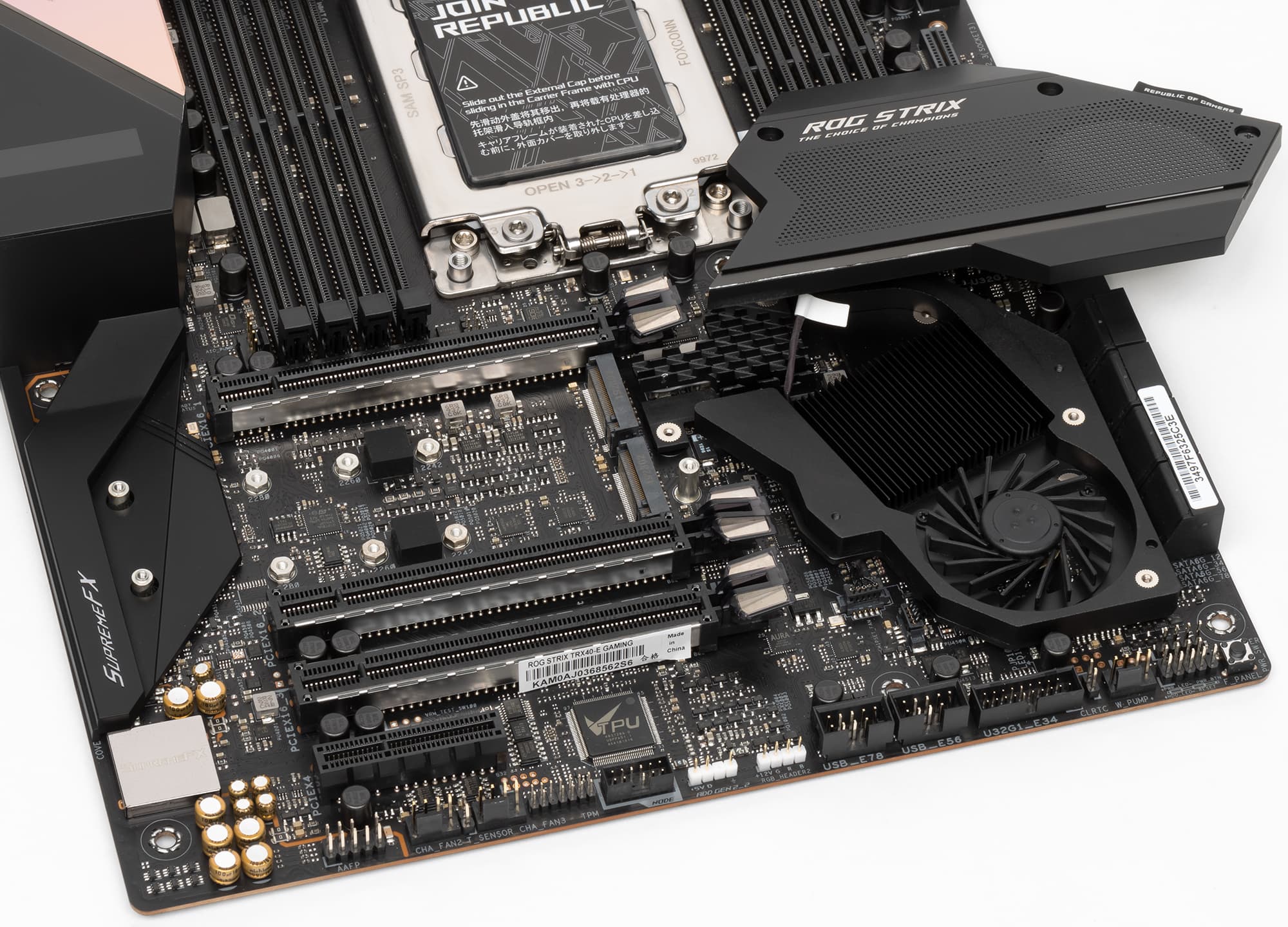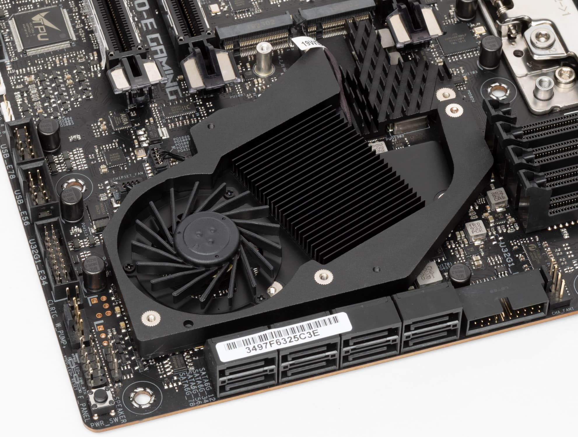 Мосфеты от схемы питания SoC имеют свой небольшой радиатор, прикрепляющийся к чипсетному и получающий также охлаждение от вентилятора на TRX40.