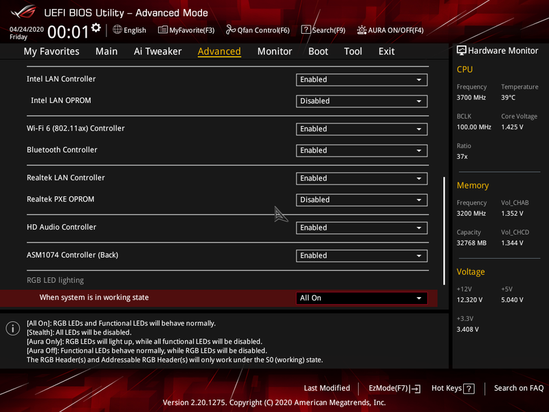 Топовые платы ROG всегда имеют красивую подсветку с особым дизайном: светодиоды образуют яркие эффекты на кожухе, покрывающем задний блок с разъемами, а также подсвечены радиатор чипсета и кожух над блоком аудио. Обычно платы линейки Strix обладают чуть-чуть более скромными подсветками, но в данном случае это не так — красивая подсветка акрилового элемента на кожухе красиво сочетается с оригинальным дизайном подсветок на кожухах радиаторов VRM и TRX40. Плюс мы помним про 4 разъема для подключения внешней подсветки, и всем этим можно управлять через программу Armoury Crate.