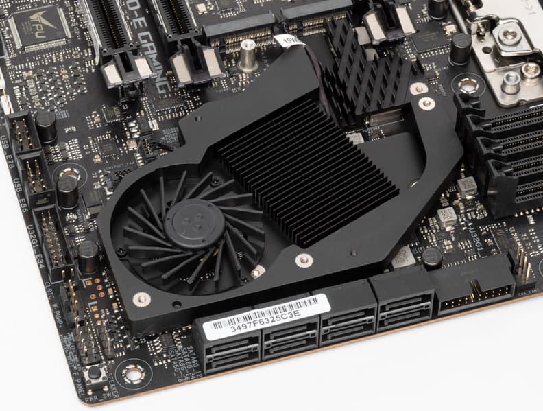 Все потенциально сильно греющиеся элементы имеют свои собственные радиаторы. Как известно, самым горячим звеном в наборе AMD TRX40 является сам чипсет, поэтому многие производители вынуждены ставить вентиляторы для такого рода микросхем.