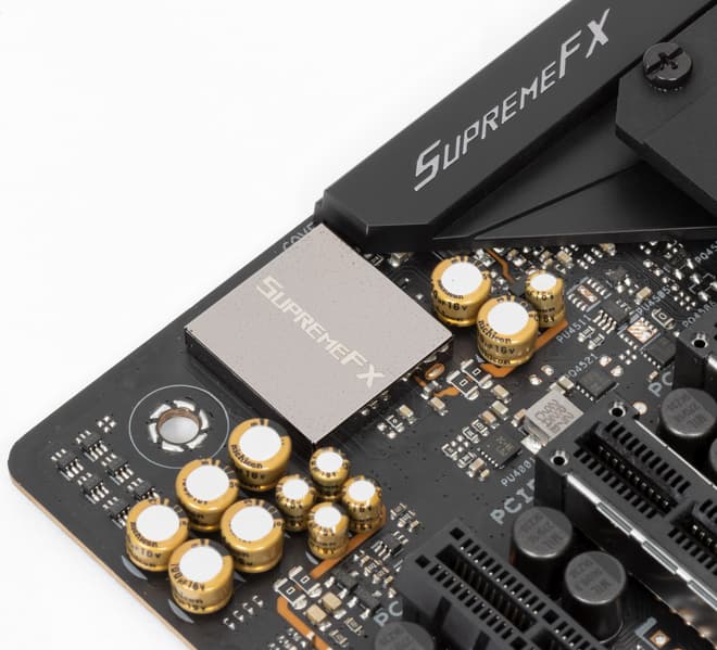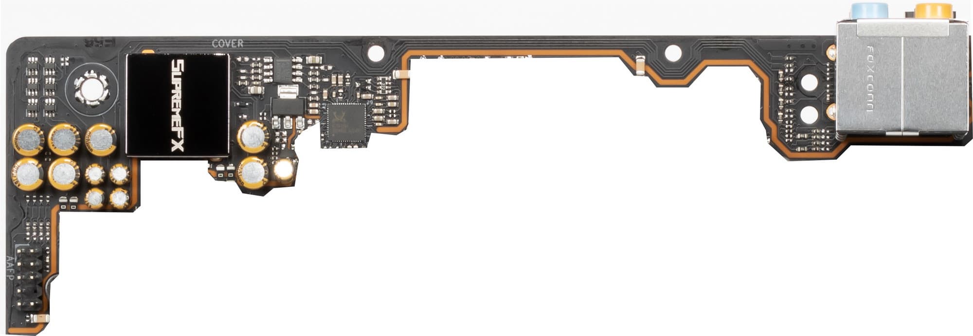 На всех платах на основе AMD TRX40 аудиоподсистема несколько отличается от традиционных. Мы знаем, что практически во всех современных материнских платах звуком заведует аудиокодек Realtek ALC1220 (он и в данном случае есть — просто Asus любит его закрывать всякими экранами, и сейчас он находится под «SupremeFX»). Он обеспечивает вывод звука по схемам до 7.1.