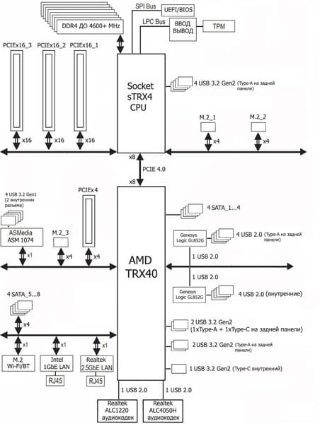 Помимо вышесказанного TRX40 поддерживает до 8 портов USB 3.2 Gen2, до 4 портов USB 2.0, и до 4 портов SATA.