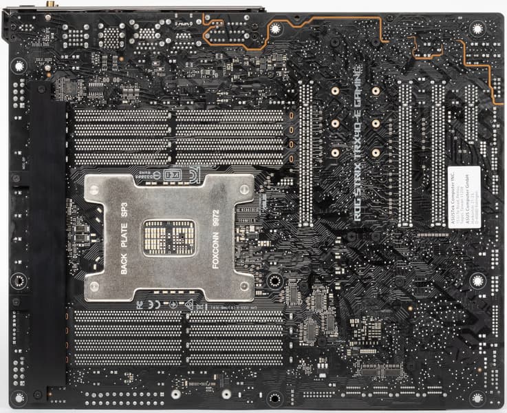 Материнская плата ROG Strix TRX40-E Gaming выполнена в форм-факторе ATX, имеет размеры 305×244 мм и 9 монтажных отверстий для установки в корпус.