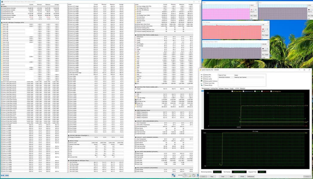 Снова мы видим, что использование более мощной ЖСО (по сравнению с предыдущими тестированиями) дало свой эффект: AMD PB2 сразу дал возможность частотам по ядрам подняться до 4,0 ГГц и выше, при этом они меняются весьма вяло, то есть разброс довольно мал с разовыми всплесками до 4,5 ГГц (по 1-2 ядру). И при этом максимальный нагрев процессора был около 82,5 °C. Я уже писал, что такой обычной «водянки», как наша от Cooler Master (а ее должно хватать на TDP 350 Вт), явно недостаточно для такого мощного процессора! Вообще тут любая обычная СО будет работать на максимуме возможностей. Очевидно, что при такой СО оверклокерам делать больше нечего, за них все сделала AMD. Им надо ставить дорогие ЖСО из ряда «все в одном» (они же называются еще необслуживаемыми), рассчитанные на лимиты в 500 Вт и выше (мы знаем, что обычно все пропиаренные лимиты завышены, поэтому если хотите покрыть 350 Вт, берите «водянку» на 500 Вт). Либо покупать и устанавливать кастомные водяные системы охлаждения.