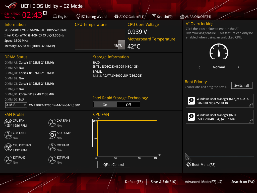 Система питания имеет 13 фаз (2×6+1) для ядра и 2×1 для памяти, она способна обеспечить работу любых совместимых процессоров под хорошим авторазгоном (при слабом конвертере питания HEDT-процессоры не только не поднимали бы частоты выше номинала, но и вряд ли дотягивали бы даже до него). Плата имеет отменное охлаждение, которое предусматривает массивные радиаторы на силовых элементах системы питания и на чипсете, 8 разъемов для вентиляторов и помп, радиаторы для всех накопителей в горизонтально расположенных слотах M.2.