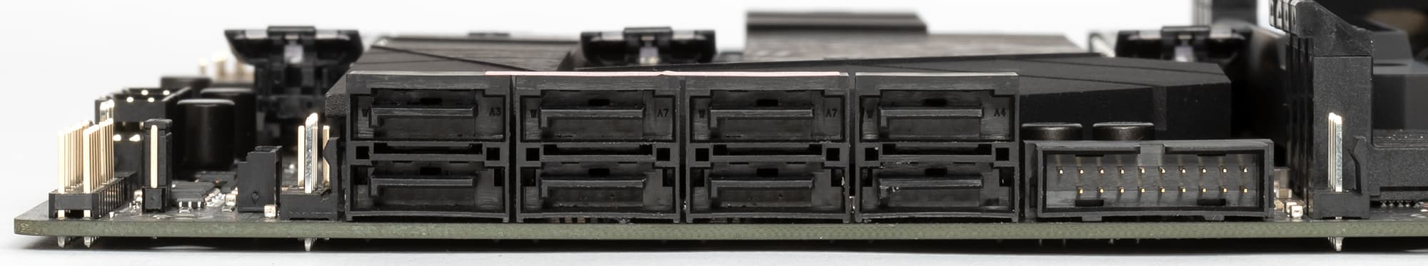 Всего у платы 8 разъемов Serial ATA 6 Гбит/с + 3 слота для накопителей в форм-факторе M.2. (Еще один слот M.2, спрятанный под кожухом блока разъемов задней панели, занят контроллером беспроводных сетей Wi-Fi/Bluetooth.). Все порты SATA реализованы через чипсет X299.