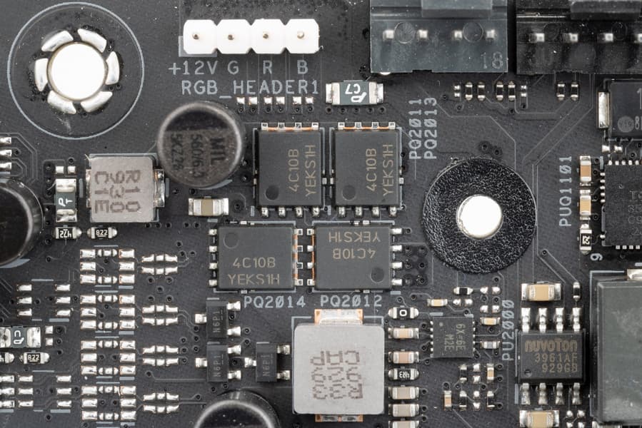Каждый канал фазы имеет суперферритовую катушку и транзисторную сборку IR3555M на 60 A от International Rectifier (входит в состав Infineon).