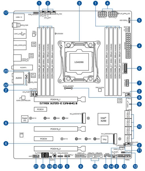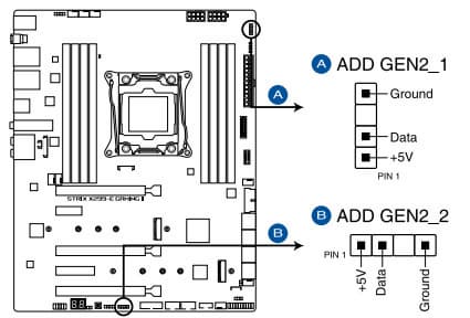 - Переключатель: если CPU с 48 или 44 линиями PCIe, то слот PCIe x16_2 получает 16 линий; в противном случае (CPU с 28 линиями PCIe) — 8 линий (i9-10xxxX +16=32, i9/i7-9xxxX/79xxX +16=32, i7-78xxX +8=24);
