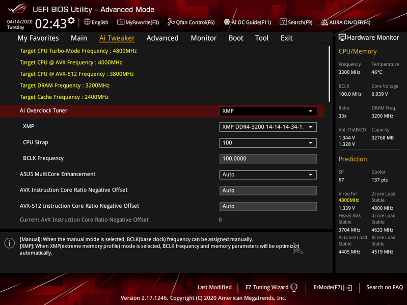 ВО! 4,4 ГГц по всем ядрам! Круто! При этом максимальный нагрев остался тем же — 86 °C, энергопотребление выросло до 222 Вт (максимум). Термо-шумовые параметры VRM/PCH остались теми же, не выше 60 °C. В общем, пришлось убрать AI Optimized, затем тупо вручную через AI-Suite выставить те самые 4,4 ГГц по всем ядрам, через настройки TPU задать экстремальный режим схемы питания, и оно заработало. Все тесты прошли на «ура», под полной нагрузкой система работала 2 часа (Мосэнергосбыт радостно потирает ручки). Стабильность в порядке. Увы, но в данном случае «интеллигентный» авторазгон годен лишь для собственных бенчмарков.