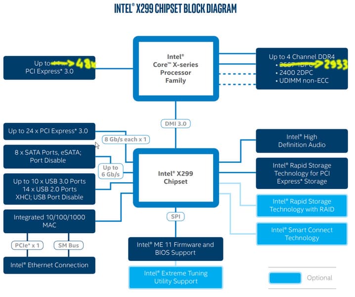 Появление корректировки в блок-схеме Х299 (желтым цветом) обязано обновлению процессоров (а не чипсета): Core i9-10xxxX имеют уже 48 линий PCIe, а также способны работать с более быстрой памятью (хотя 2933 МГц — это официально установленная Intel граница, производители вольны в каждом случае ставить лимиты по частотам выше, а также применять XMP-профили модулей памяти).