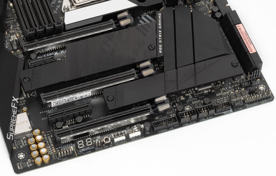 Последний слот PCIe x16 работает максимально в режиме х8, и его можно вполне использовать для любой периферии, включая NVMe-накопители, создавая очень быстрые RAID-массивы. Собственно, как и второй по счету слот PCIe x4, однако он подключен уже с Х299, а не напрямую к CPU. А вот слот PCIe x1 (второй по общему счету) делит ресурсы с портом USB 3.2 Gen2 (внутренний Type-C) (то есть при использовании последнего слот PCIe x1 будет отключен). Собственно, это не играет никакой роли, ибо все равно PCIe x1 всегда будет под видеокартой, установленной в первый слот.