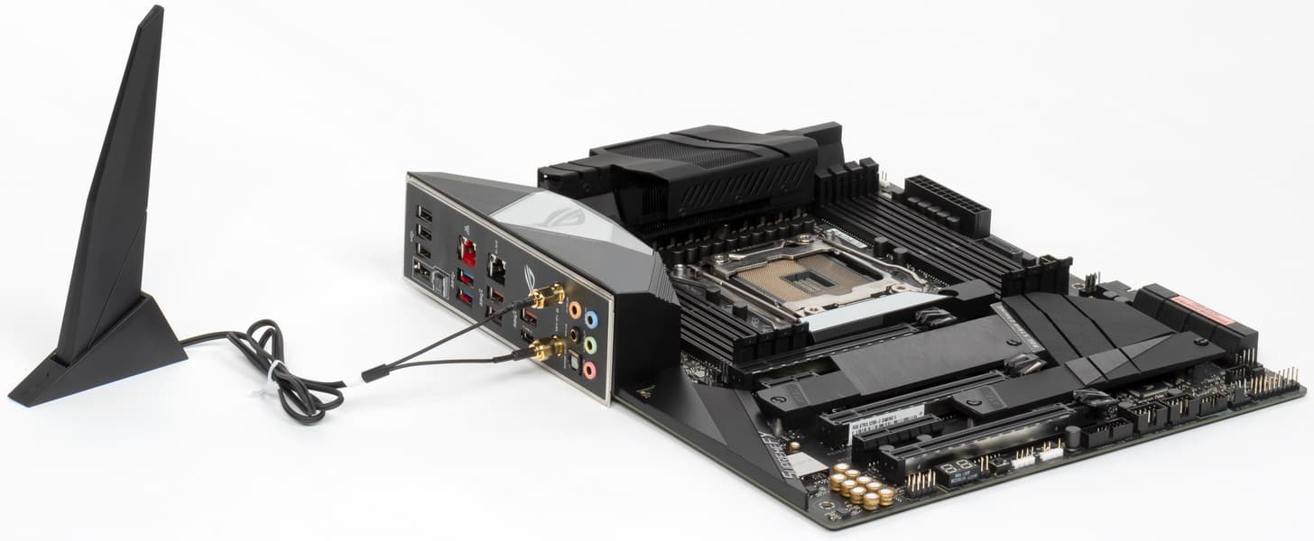 Набор периферийных возможностей включает 19 портов USB разных видов (включая 5 самых быстрых на сегодня), 3 слота PCIe x16 (первые два всегда имеют по 16 линий в случае установки процессора Core X двух последних поколений, а третий конфигурируется в зависимости от поколения установленного процессора) с возможностью организации Nvidia SLI или AMD CrossFire, 3 слота M.2, 2 проводных сетевых адаптера, включая один быстрый (2,5 Гбит/с), и современный беспроводной контроллер с поддержкой Wi-Fi 6 и Bluetooth 5.0. На задней панели платы есть порт USB Type-C (обеспечивающий не только очень высокую скорость передачи данных, но и быструю зарядку мобильных устройств) и три аналогичных быстрых порта USB 3.2 Gen2 Type-A. Странно смотрятся целых 8 медленных и старых USB 2.0, вместо которых от чипсета X299 можно было вывести еще 4 USB 3.2 Gen1.
