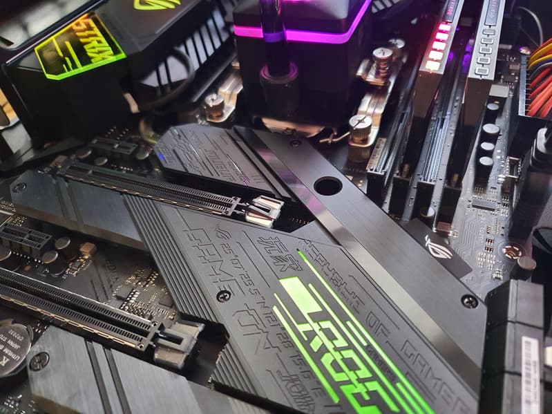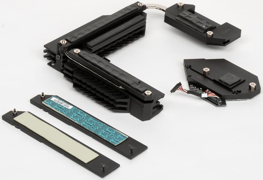 Оба M.2 слота на самой матплате оснащены радиаторами. Нижний M.2_2 имеет радиатор, который не связан с какими-то иными устройствами охлаждения на данной плате. Верхний M.2_1 имеет радиатор, конец которого — под крышкой чипсетного радиатора, без демонтажа которой его не снять.