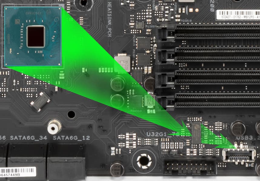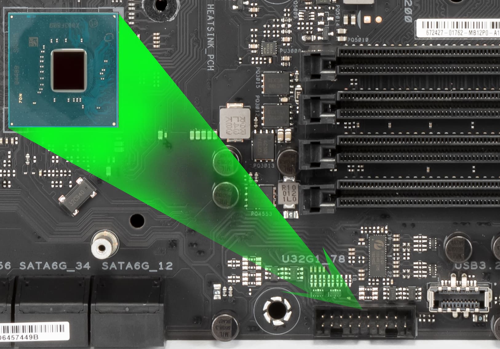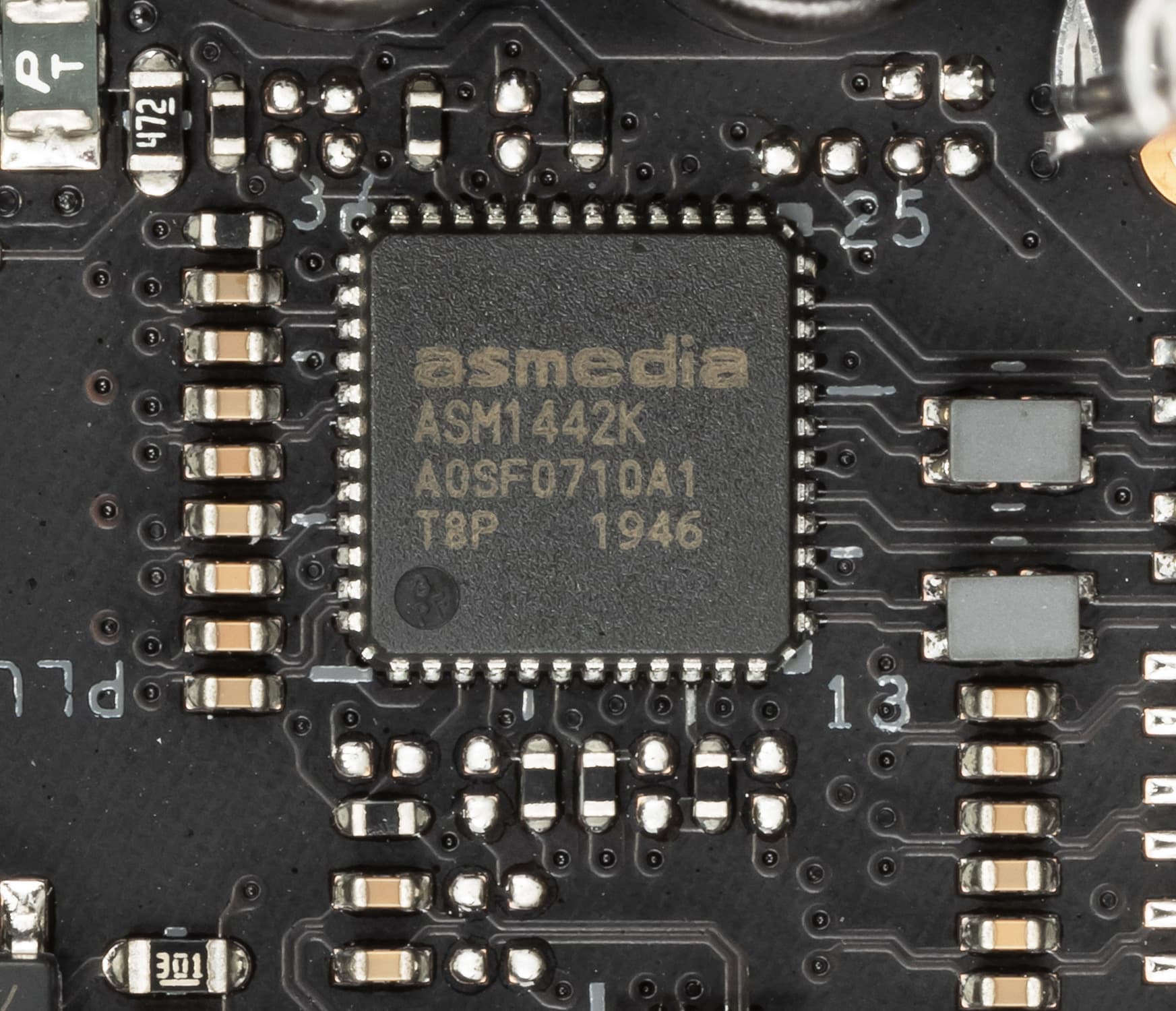 Все самые быстрые USB порты Type-A/Type-C оснащены ре-драйверами ASM1543 от ASMedia, дающими устойчивый вольтаж, способный обеспечить быструю зарядку мобильных гаджетов через них.