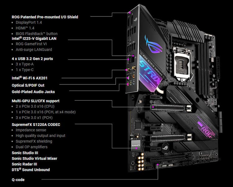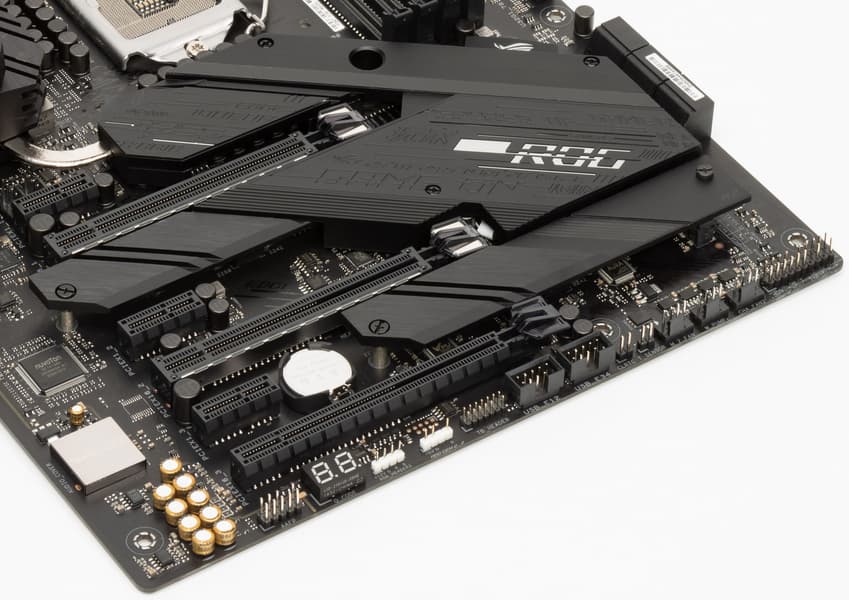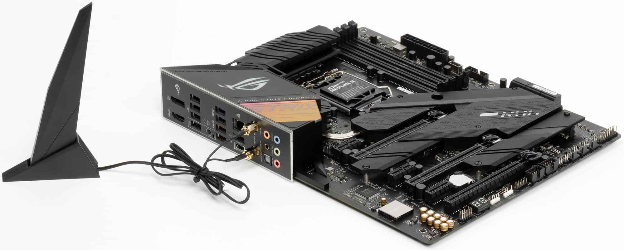 Функциональность ROG Strix Z490-E включает 17 портов USB разных видов (включая 5 USB 3.2 Gen2 со скоростью 10 Гбит/с), 3 слота PCIe х16 (из которых первые два получают 16 линий PCIe от процессора с возможностью создать Nvidia SLI или AMD CrossFire, а третий слот PCIe х16 работает в режиме x4 для карт расширения либо для AMD CrossFire из трех видеокарт), три PCIe x1, два слота M.2, 6 портов SATA. Система питания процессора использует 16 фаз (2×7+2×1) и способна обеспечить работу любых совместимых процессоров под серьезным авторазгоном. Плата имеет мощные радиаторы на силовых элементах конвертера питания, усиленные комплектным вентилятором, 8 разъемов для подключения вентиляторов и помп, также радиаторами оснащены все накопители в слотах M.2. Дополняют картину скоростной проводной сетевой 2,5-гигабитный контроллер, а также беспроводной контроллер, реализующий Wi-Fi 802.11ac и Bluetooth 5.0.
