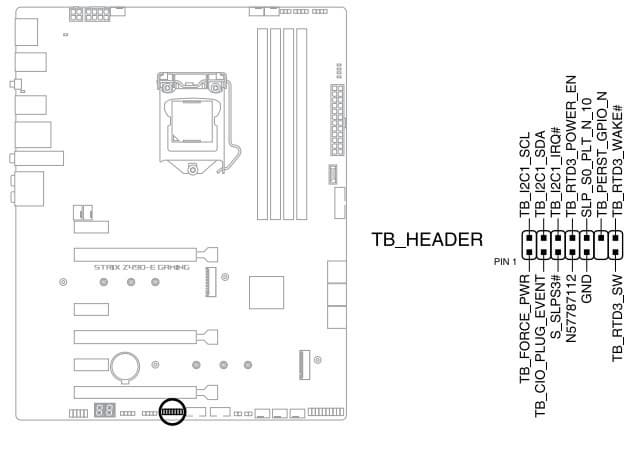 Материнская плата поддерживает платы расширения Thunderbolt 3, для подключения которых имеется отдельный разъем.