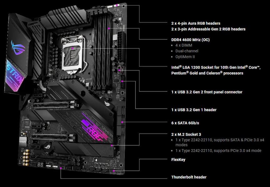 Так вот, и внутри ROG есть также разделение продуктов по двум основным линейкам: самые навороченные модели имеют типовые имена без добавок названий чипсетов: Maximus (Intel mainstream), Rampage (Intel HEDT), Crosshair (AMD mainstream), Zenith (AMD HEDT). Это одна линейка (в которой свои 4 подлинейки, запутаться уже можно). А есть большая линейка Strix, куда уже с названиями чипсетов входят платы ROG, но попроще, без особых наворотов, хотя все равно явно не среднебюджетные. Если в начале изучения потока новых материнских плат на базе Intel Z490 я изучал платы из серии ROG Maximus, то теперь очередь дошла и до одной из типовых серий для чипсета Z490 — ROG Strix Z490-E Gaming. Не забываем, что и внутри Strix есть несколько вариантов исполнений на одном и том же чипсете. (А еще есть вообще — не ROG, иные суббренды, короче ассортимент матплат настолько велик, что даже внутри Asus часто проводятся тренинги, чтобы сотрудникам разъяснять — чем и как линейки отличаются, и почему они часто пересекаются).
