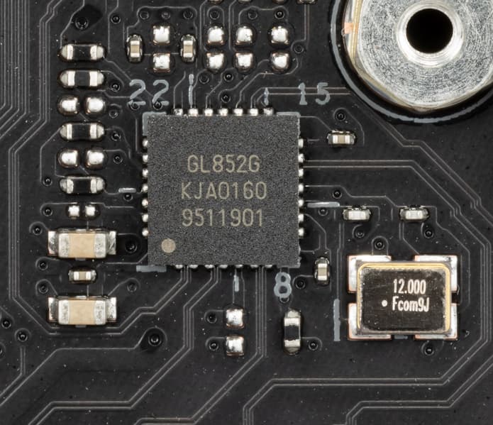 - 8 портов USB 2.0/1.1: 4 реализованы через один контроллер Genesys Logic GL852G (на него потрачен 1 порт USB 2.0 от Z490) и представлены двумя внутренними разъемами (каждый на 2 порта); еще 4 реализованы через второй Genesys Logic GL852G (на него потрачен 1 порт USB 2.0 от Z490) и представлены портами Type-A на задней панели (черные).