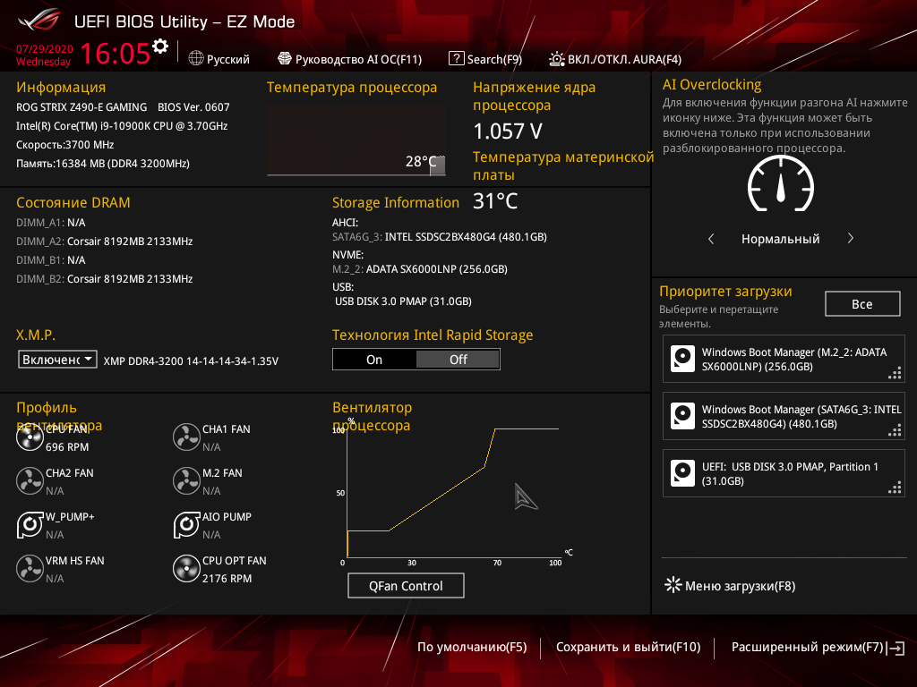 Для установки модулей памяти на плате ROG имеется четыре DIMM-слота (для работы памяти в Dual Channel в случае использования всего 2 модулей их следует устанавливать в А2 и B2. Плата поддерживает небуферизованную память DDR4 (non-EСС), а максимальный объем памяти составляет 128 ГБ (при использовании UDIMM последнего поколения по 32 ГБ). Разумеется, поддерживаются профили XMP.