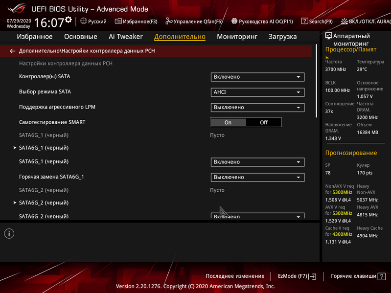 Всего у платы 6 разъемов Serial ATA 6 Гбит/с + 2 слота для накопителей в форм-факторе M.2. (Еще один слот M.2, спрятанный под кожухом блока разъемов задней панели, занят контроллером беспроводных сетей Wi-Fi/Bluetooth.). 6 портов SATA реализованы через чипсет Z490 и поддерживают создание RAID.