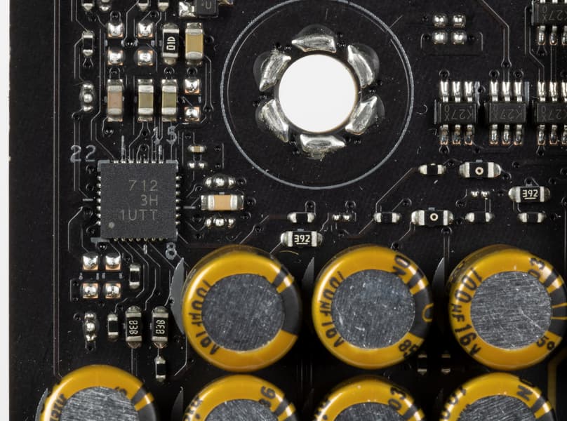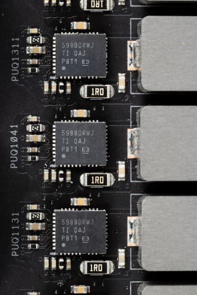 Каждый канал фазы имеет суперферритовый дроссель и CSD59880RWJ MOSFET от Texas Instruments на 90 А.
