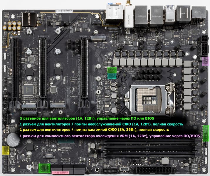 Теперь про блок ввода-вывода, разъемы для подключения вентиляторов и т. п. Разъемов для подключения вентиляторов и помп на самой плате — 8. Схема размещения коннекторов для систем охлаждения выглядит так: