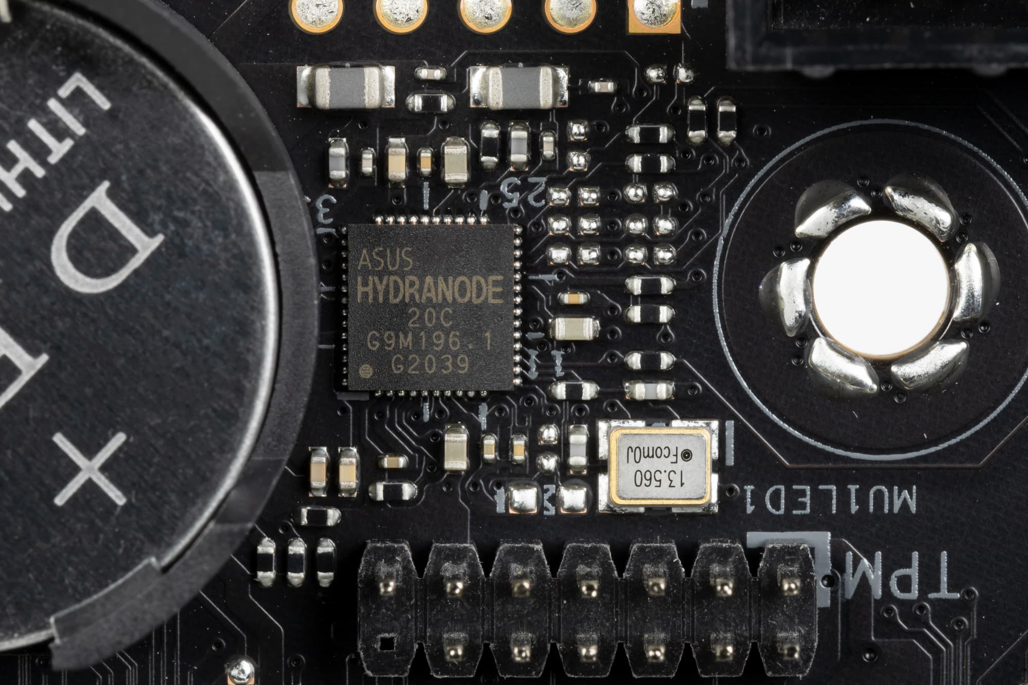Через ПО или BIOS контролируется 6 гнезд для подключения воздушных вентиляторов или помп: они могут управляться как через ШИМ, так и банальным изменением напряжения/тока (еще 2 гнезда расчитаны на полную скорость – для помп СЖО). В сфере управления вентиляторами у Asus появилось новшество в виде Asus Hydronode.