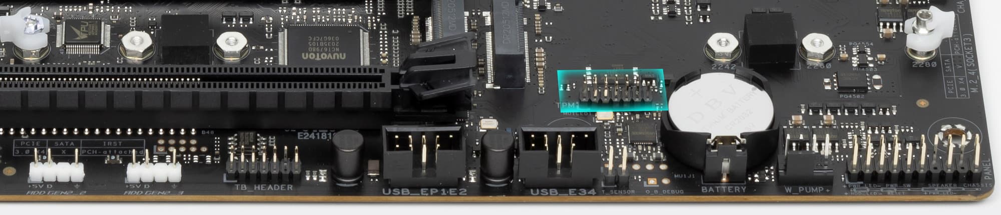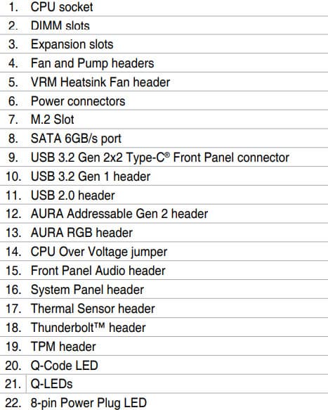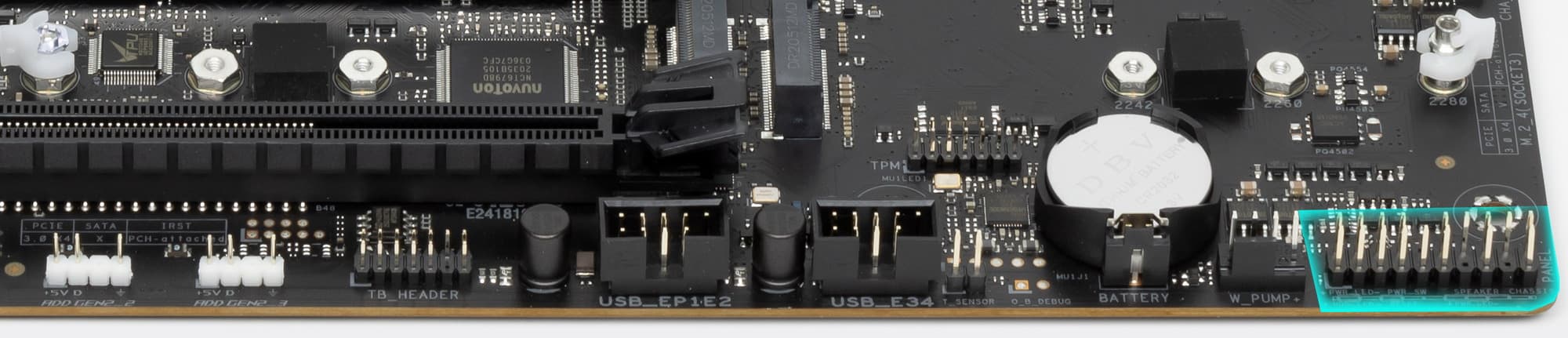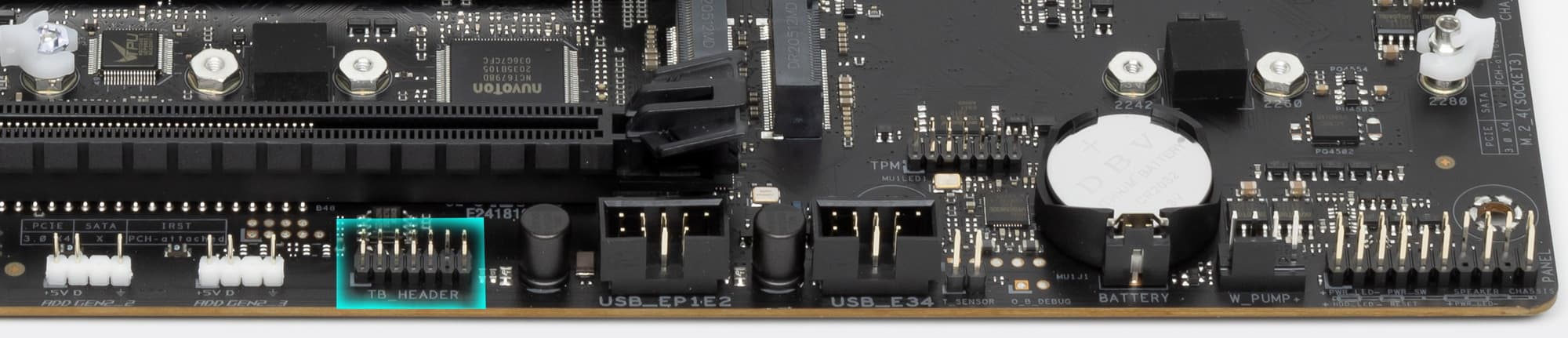 | Прочие внутренние элементы | 24-контактный разъем питания ATX 1 8-контактный разъем питания EPS12V 1 4-контактный разъем питания EPS12V 1 слот M.2 (E-key), занят адаптером беспроводных сетей 1 разъем для подключения порта USB 3.2 Gen2x2 Type-C 1 разъем для подключения 2 портов USB 3.2 Gen1 2 разъема для подключения 4 портов USB 2.0 8 разъемов для подключения 4-контактных вентиляторов и помп ЖСО 1 разъем для подключения неадресуемой RGB-ленты 3 разъема для подключения адресуемой ARGB-ленты 1 разъем аудио для передней панели корпуса 1 разъем для поднятия напряжения на процессоре CPU_OV 1 разъем для подключения плат расширения Thunderbolt 1 разъем TPM для устройств безопасности 1 разъем для термодатчикa 2 разъема для подключения управления с передней панели корпуса |