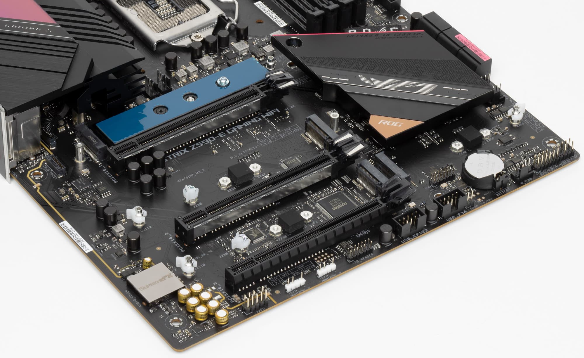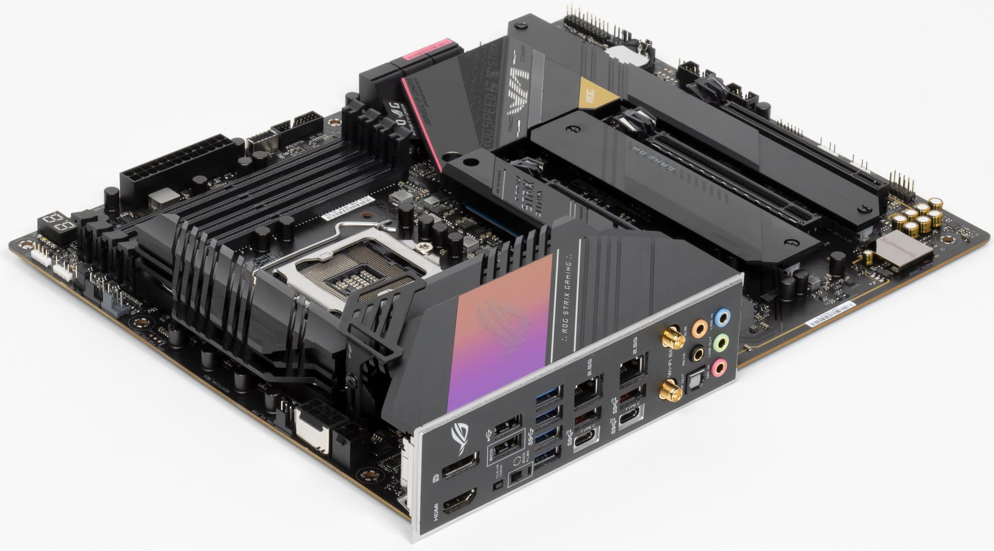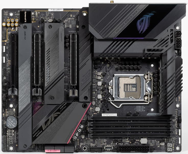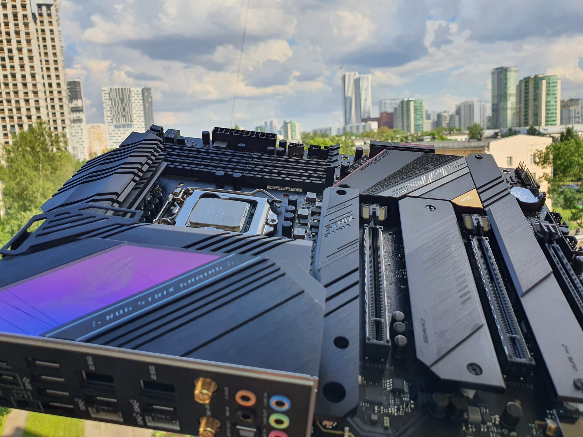 Asus ROG Strix Z590-E Gaming WiFi хоть и является представителем топовой серии ROG, но все же имеет относительно приемлемую стоимость в районе 30 с небольшим тысяч рублей. А ведь это продвинутая материнская плата с поддержкой процессоров Intel Core 11-го поколения, созданная для хардкорных геймеров, у нее имеются 17 портов USB разных видов, включая 2 самых быстрых USB 3.2 Gen2×2 и 3 очень быстрых USB 3.2 Gen2. Плата также предлагает 3 слота PCIe х16 (два из которых получают от процессора 16 линий PCIe, причем версии 4.0 в случае использования процессоров 11-го поколения), аж 4(!) слота M.2 (один из них подключен напрямую к процессору линиями PCIe 4.0, еще один также может подключаться к процессору, но для этого придется уменьшить количество линий PCIe для слотов PCIe x16).