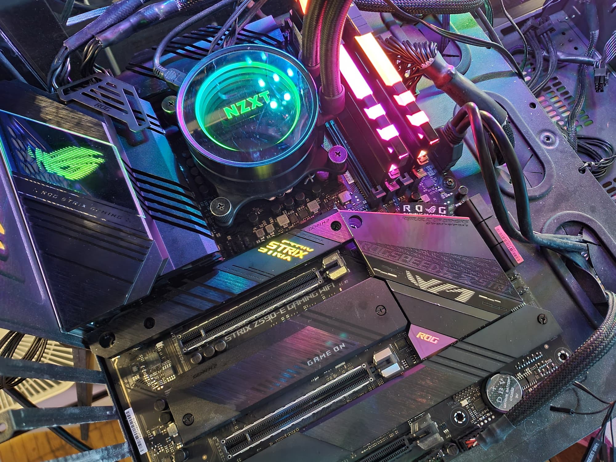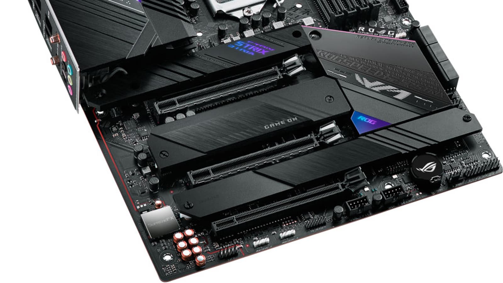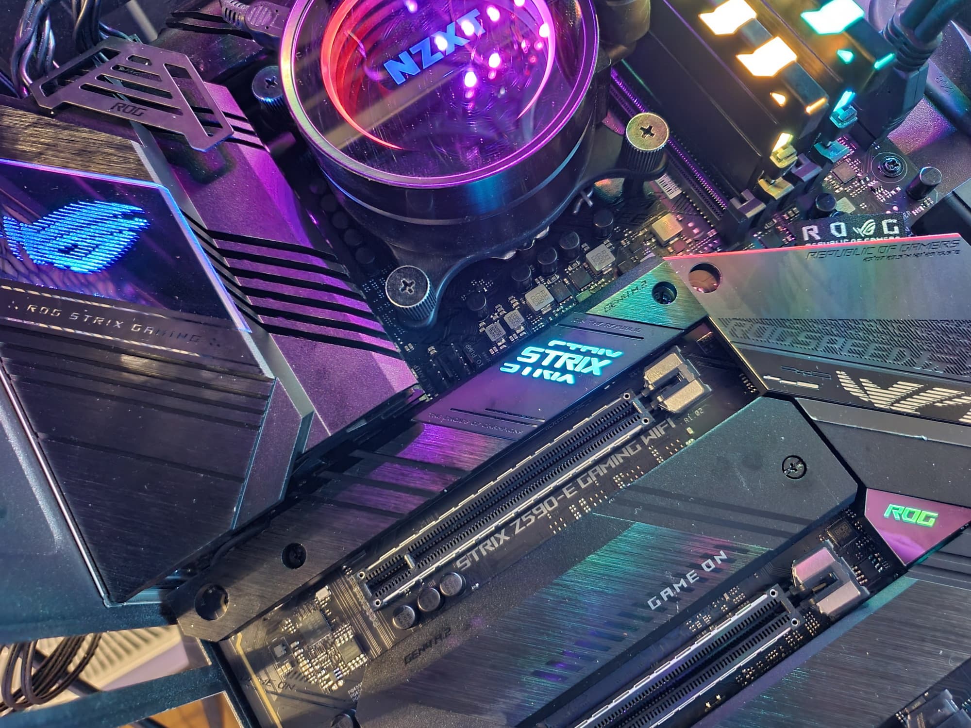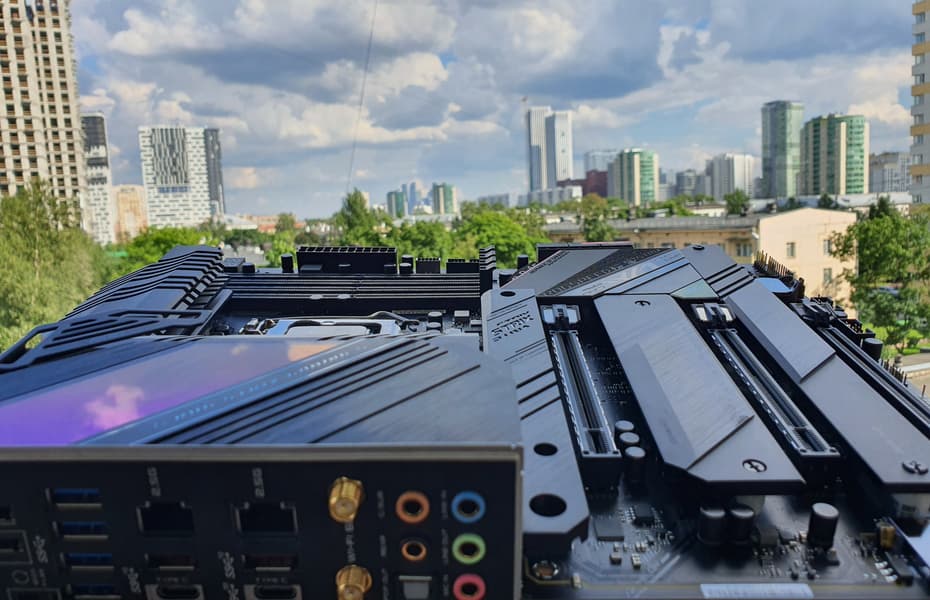 Asus ROG Strix Z590-E Gaming WiFi хоть и является представителем топовой серии ROG, но все же имеет относительно приемлемую стоимость в районе 30 с небольшим тысяч рублей. А ведь это продвинутая материнская плата с поддержкой процессоров Intel Core 11-го поколения, созданная для хардкорных геймеров, у нее имеются 17 портов USB разных видов, включая 2 самых быстрых USB 3.2 Gen2×2 и 3 очень быстрых USB 3.2 Gen2. Плата также предлагает 3 слота PCIe х16 (два из которых получают от процессора 16 линий PCIe, причем версии 4.0 в случае использования процессоров 11-го поколения), аж 4(!) слота M.2 (один из них подключен напрямую к процессору линиями PCIe 4.0, еще один также может подключаться к процессору, но для этого придется уменьшить количество линий PCIe для слотов PCIe x16).