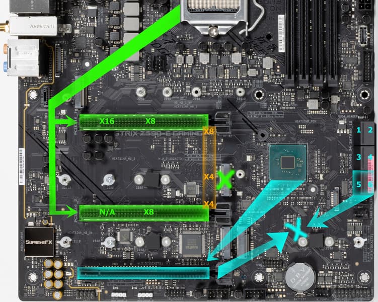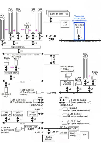 Теперь посмотрим выше на то, как работают процессоры в данной конфигурации. У CPU 11-го поколения всего 20 линий PCIe, 4 из них отведены на порт М.2 (M2_1). У CPU 10-го поколения всего 16 линий (нет выделения линий на М.2 порт). Оставшиеся 16 линий надо делить на два слота PCIe x16 (_1 и _2), а также на порт М2_2 (который также «питается данными» от процессора). Вариантов переключения несколько:
