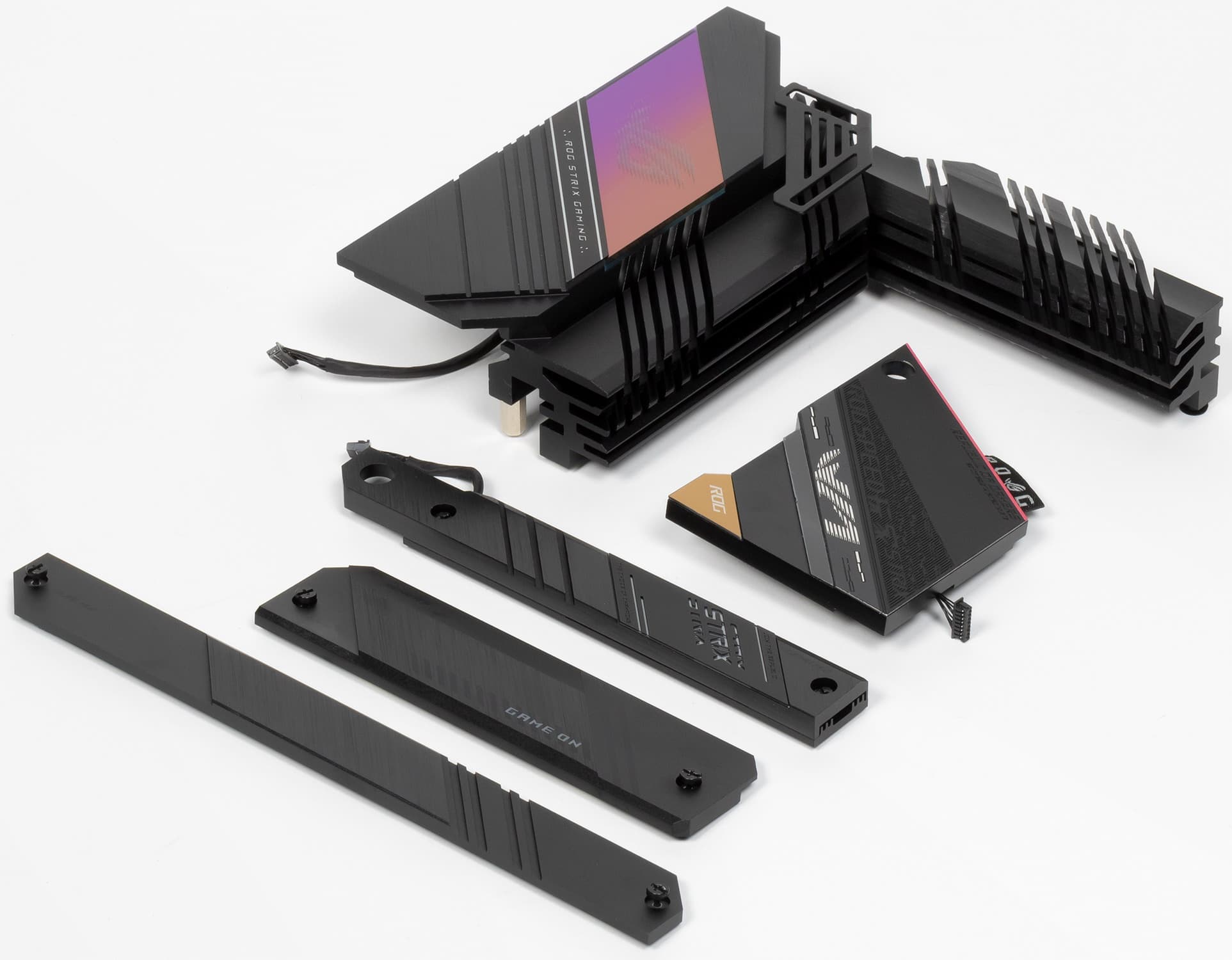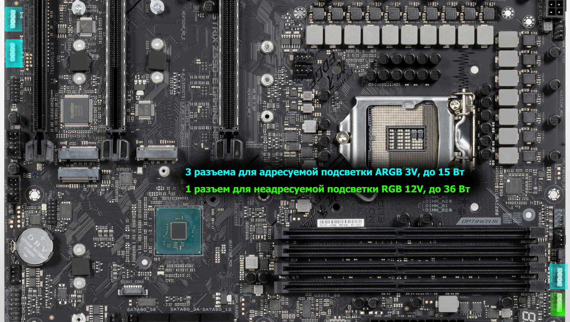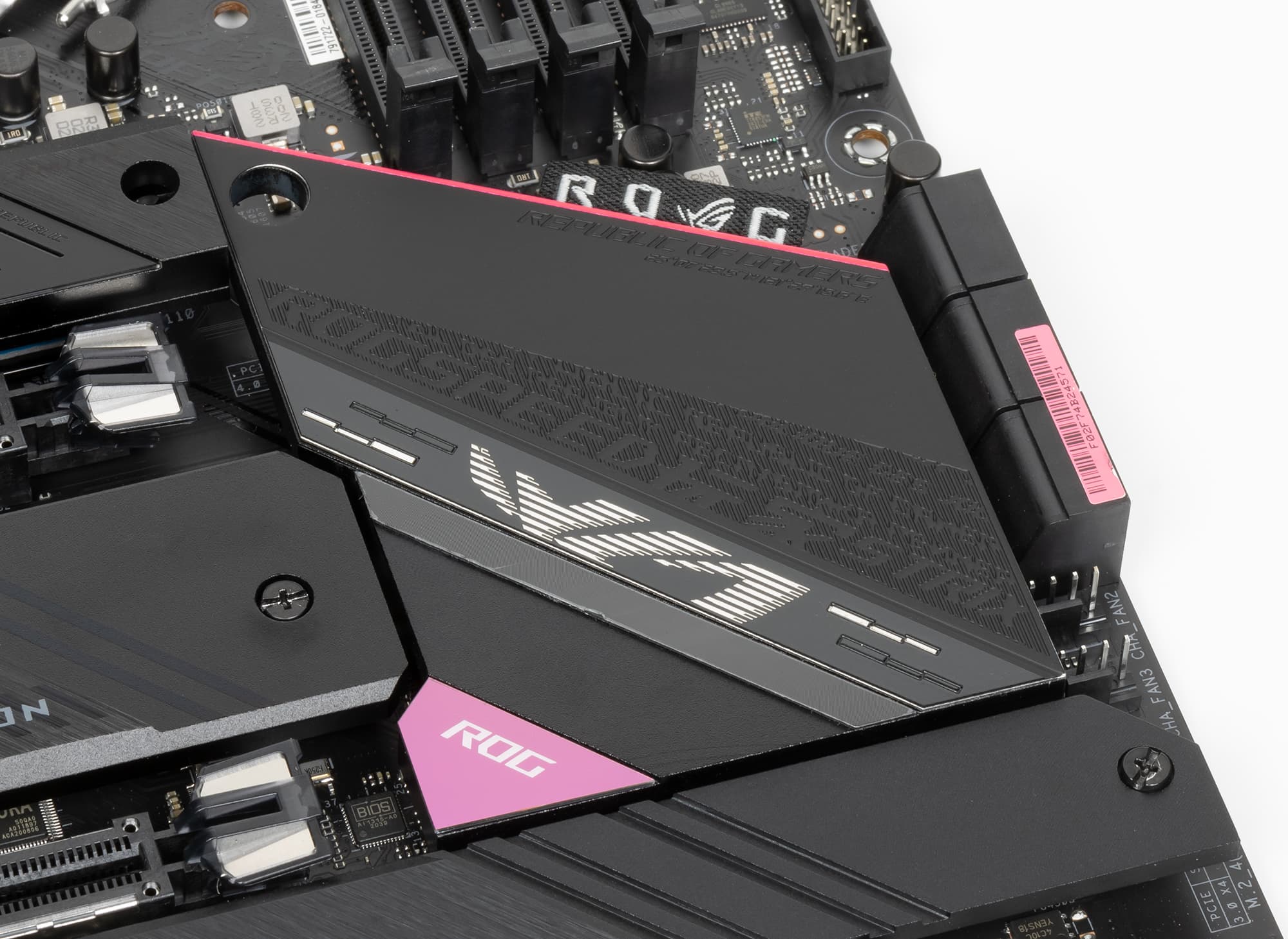 Также у нее есть 6 портов SATA и 8 разъемов для вентиляторов. Система питания процессора традиционно для моделей ROG очень мощная, она способна обеспечить работу любых совместимых процессоров с запасом на разгон и стабильность. Плата имеет грамотную систему охлаждения каждого потенциально греющегося элемента, включая накопители в слотах M.2 (термопрокладки для охлаждения накопителей есть с обеих сторон). Сетевые возможности прекрасные: два быстрых проводных контроллера 2,5 Гбит/с и один самый современный беспроводной. В числе плюсов платы можно упомянуть неплохую подсветку, включая широкие возможности для подключения дополнительных RGB-устройств. Отметим и улучшенный аудиокодек Realtek ALC4082.
