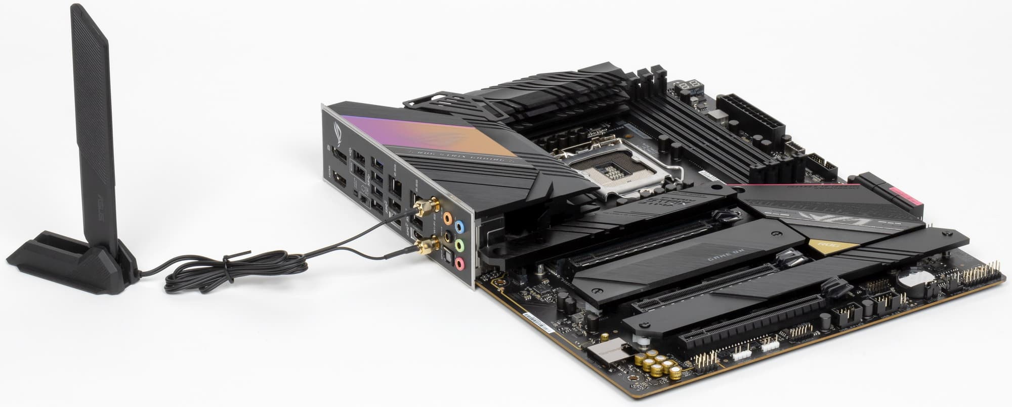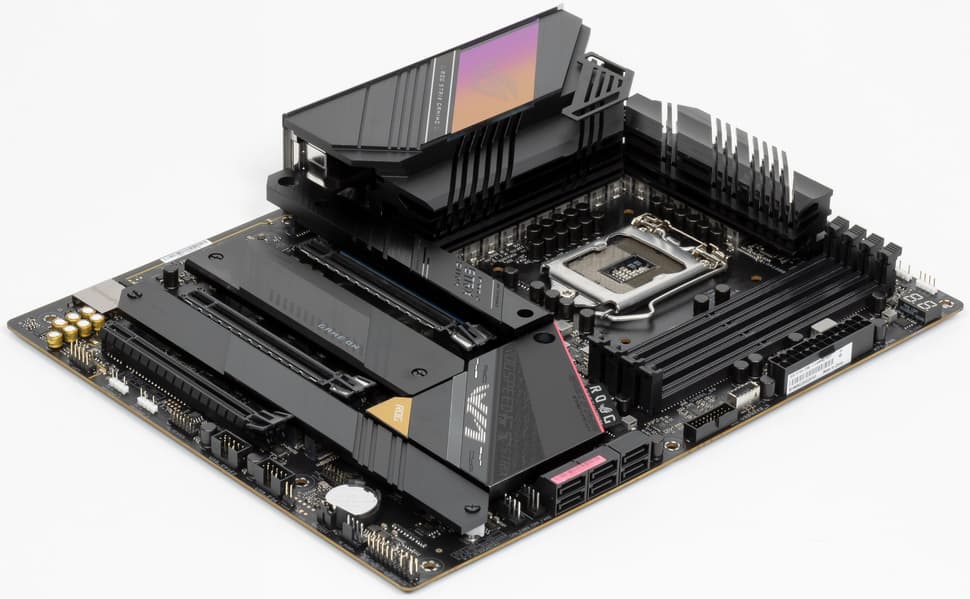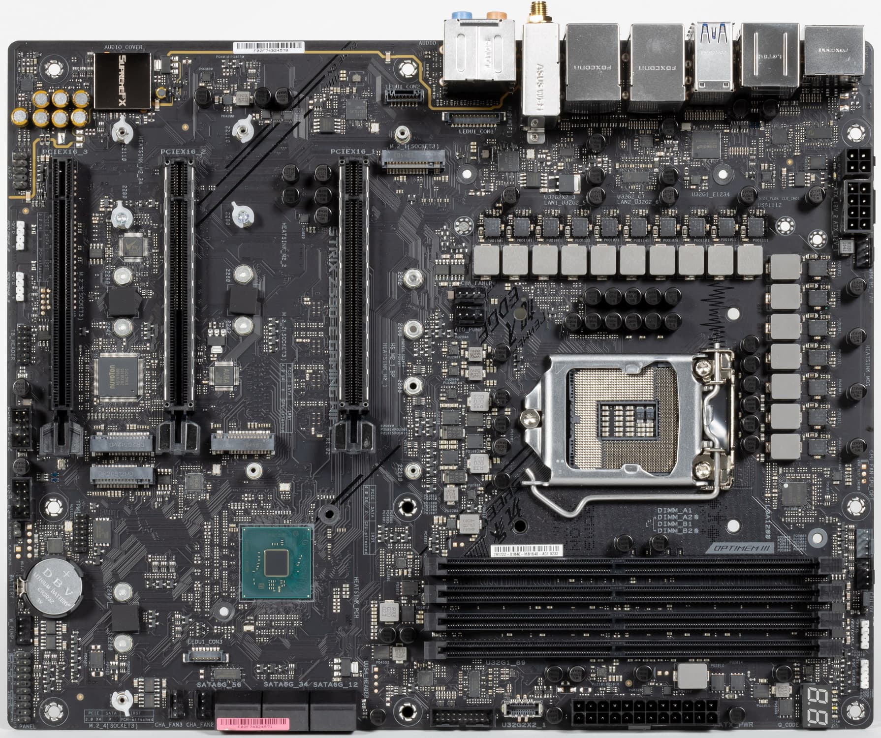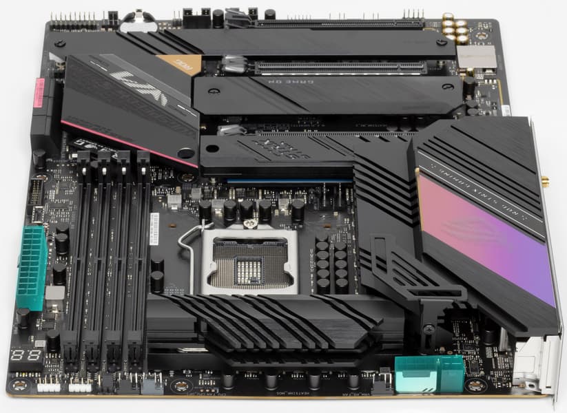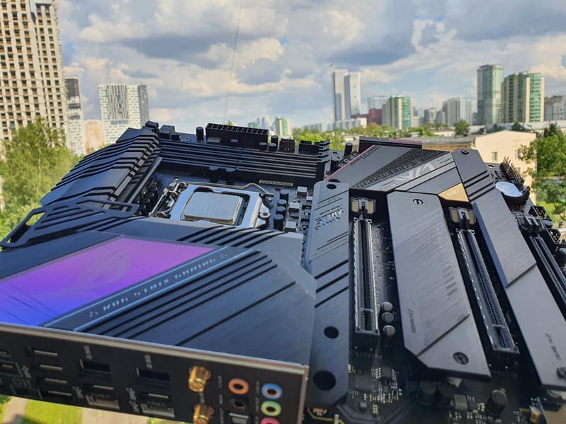 Также у нее есть 6 портов SATA и 8 разъемов для вентиляторов. Система питания процессора традиционно для моделей ROG очень мощная, она способна обеспечить работу любых совместимых процессоров с запасом на разгон и стабильность. Плата имеет грамотную систему охлаждения каждого потенциально греющегося элемента, включая накопители в слотах M.2 (термопрокладки для охлаждения накопителей есть с обеих сторон). Сетевые возможности прекрасные: два быстрых проводных контроллера 2,5 Гбит/с и один самый современный беспроводной. В числе плюсов платы можно упомянуть неплохую подсветку, включая широкие возможности для подключения дополнительных RGB-устройств. Отметим и улучшенный аудиокодек Realtek ALC4082.
