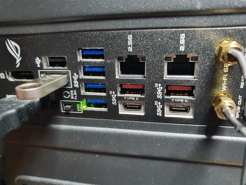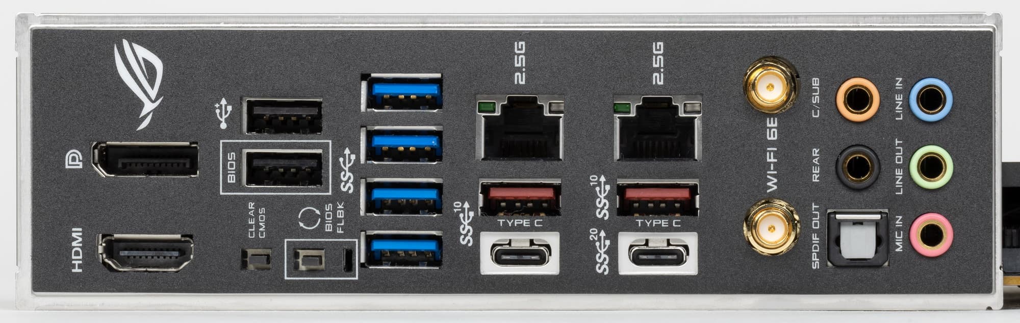 | Разъемы на задней панели | 2 × USB 3.2 Gen2 (Type-C) 2 × USB 3.2 Gen2 (Type-A) 4 × USB 3.2 Gen1 (Type-A) 2 × USB 2.0 (Type-A) 2 × RJ-45 5 аудиоразъемов типа миниджек 1 × S/PDIF (оптический, выход) 1 × HDMI 2.0b 2 антенных разъема кнопка сброса CMOS кнопка перепрошивки BIOS — Flashback |